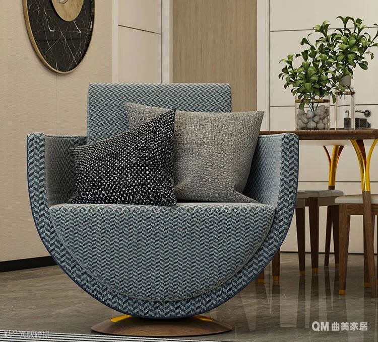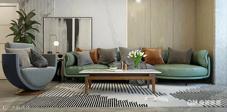 因为客厅比较大,所以选择了异形沙发填充空间,同时营造差异化的视觉感。通过圆形沙发、方形茶几、室内软地毯、装饰画及工艺品的搭配,客厅空间摆脱了固有的印象,展现出一种颇具艺术气息的治愈氛围感,充分表达了户主“轻奢华,新时尚”的生活诉求。