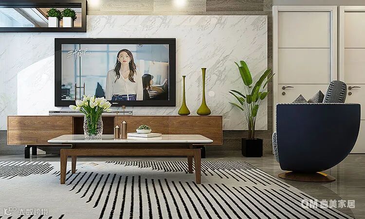 电视墙以大理石纹墙面搭配定制的木色电视柜,呈现简约大方、高级舒适的视感,一侧的绿植点缀下,空间更显活泼明快。