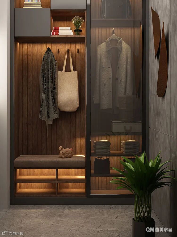在柔和的灰色墙面衬托下,玄关柜以极富张力的设计表现确立了整体空间的基调:轻奢、简约。立柜不仅起到了调节拉高空间的作用,也让入户空间的装饰更强,搭配灯带和木质立面,质感扑面而来。