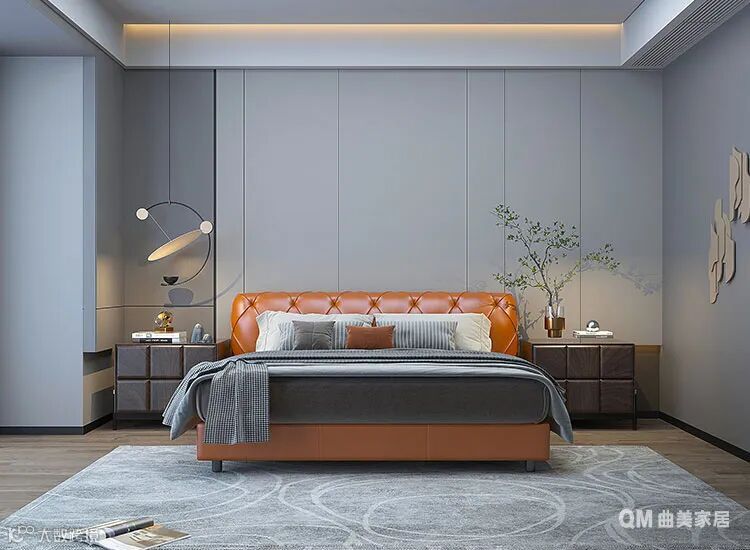 整体墙壁及护墙板以灰色为主,延续全屋设计风格,以简约装饰塑造大方轻奢的质感,皮质大床颜色鲜艳动感,点亮了整体空间,冲淡了灰色带来的冷峻感;与木质肌理的床头柜也形成了颜色上的有效互补,绿植则为空间带来了一抹自然生动。