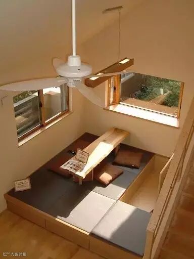 选择中部带有升降高台的榻榻米,当高台升起来的时候,可以作为看书、饮茶的桌子,在不用的时候又可以放下去,成为一个平面当床来睡,是不是相当贴心呢?