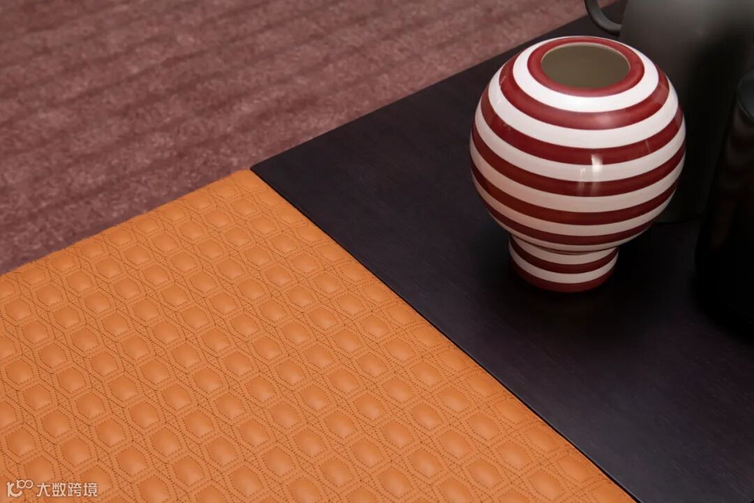 茶几桌面采用实木与硬皮革两种完全不同的材质混搭,木的温润坚硬与皮的柔软细腻结合,以软硬兼施、交错开合的设计手法,赋予空间独特创意。