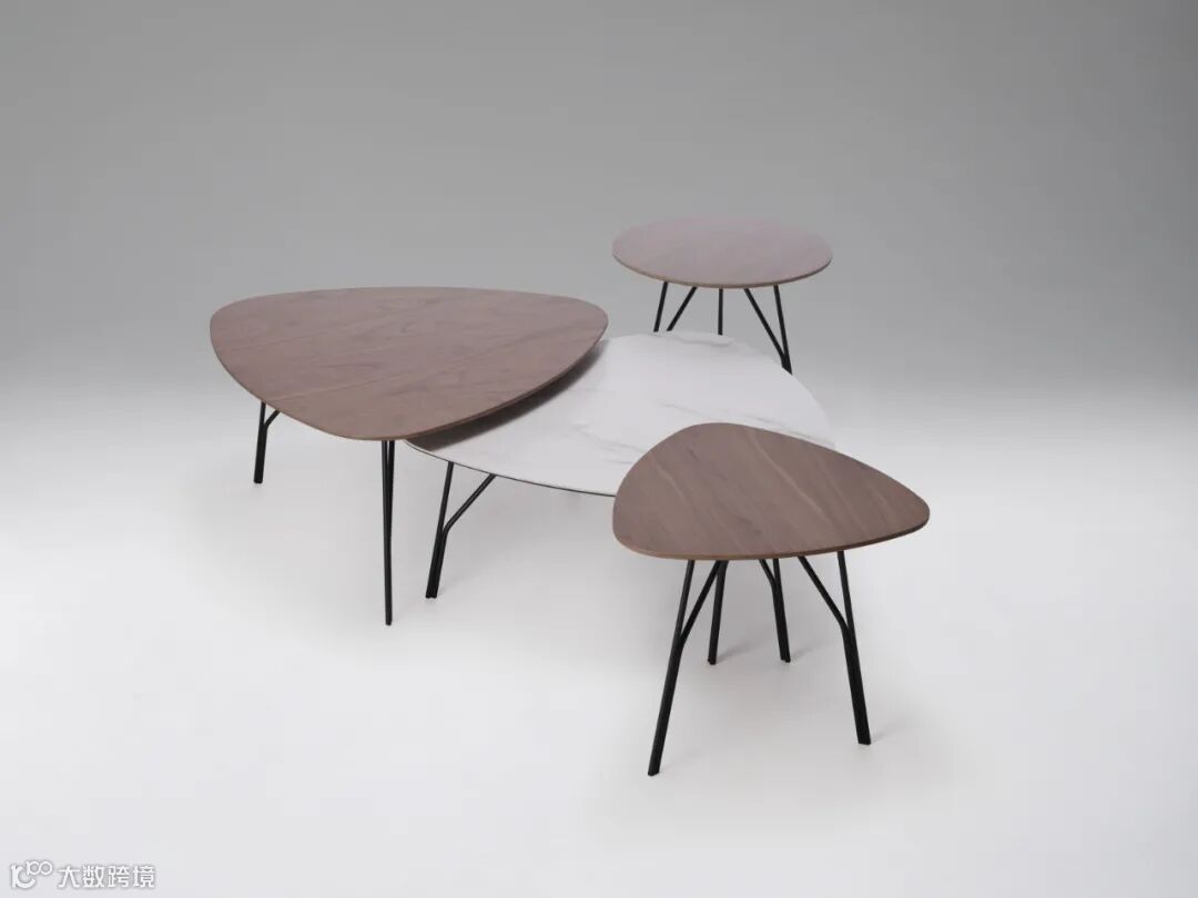 用流畅线条做造型,勾勒出轻奢北欧的品味客厅。不规则三角套几设计,几面采用圆润造型处理,桌腿采用简约的三脚设计,每一寸皆精细平滑。