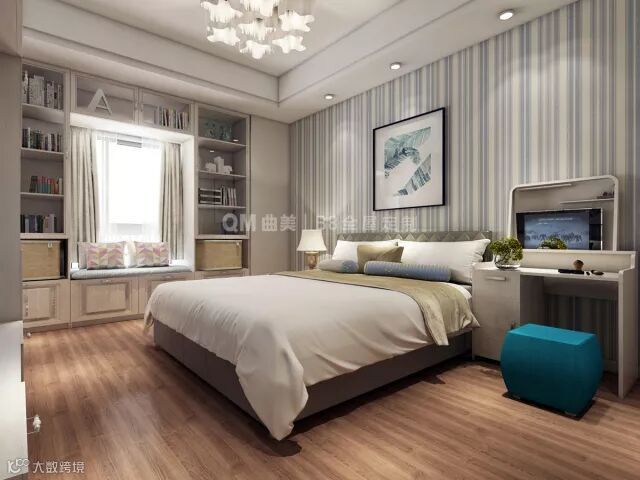 主卧的床头背景墙是竖条纹的浅灰蓝主题色,以增强空间的节奏感。大大的嵌入式飘窗超强收纳,又带给房间整整一屋子的阳光。随着季节变化,由自然光影流泻出的氛围,在开放的空间中交织出视觉美感,舒适而明亮。