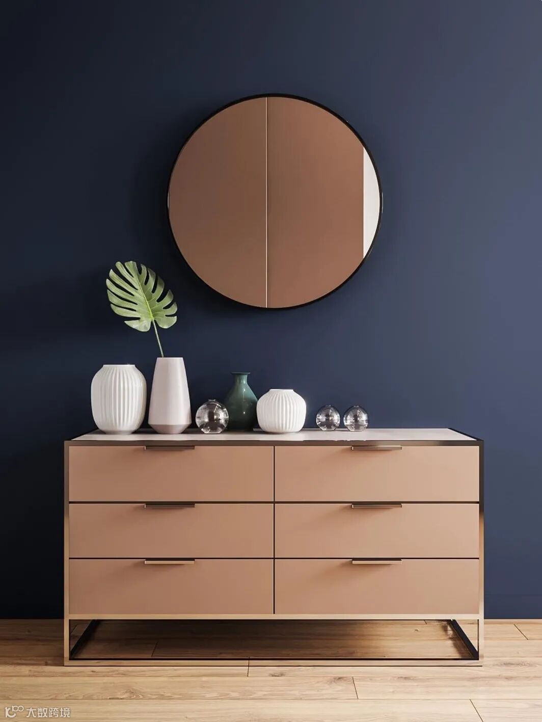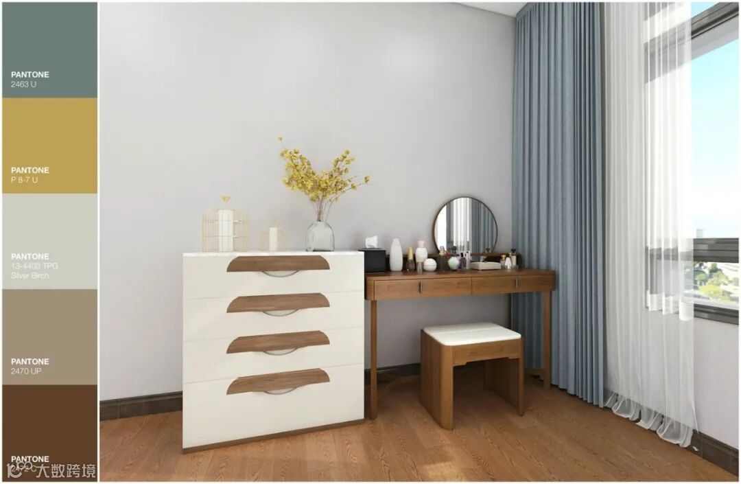 爱美的心虽然永远都不能满足,但是爱美的工具必须常备。梳妆台为打造“惊艳妆容”而来,选取胡桃色为主色,灰蓝色为辅色,铜色,明黄色为点缀色。以浅色边柜搭配梳妆台,再摆上一瓶鲜花,能给人带来轻松惬意的感觉。