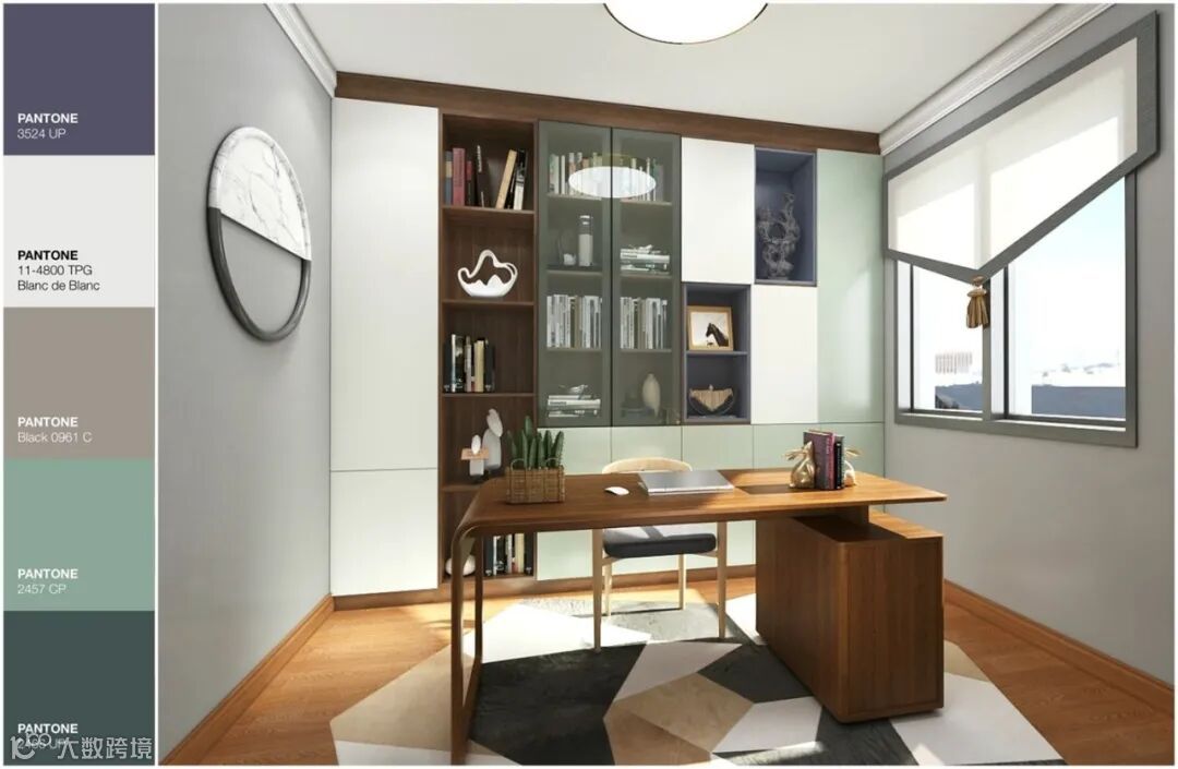 书柜采用黑框玻璃,与封闭式门相呼应,虚实结合。长条镂空部分可以摆放物件,提高品质感,局部镂空部分采用了紫蓝色套格点缀,面板大面积用豆沙绿加白色经久耐看,冷色系也会提升空间的开阔感。