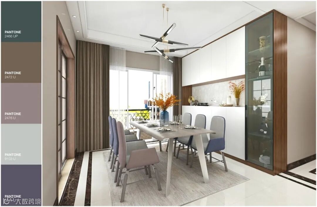 色彩之外,材质的运用与搭配,也是营造轻奢风的关键。餐厅选取浅咖色、胡桃色为主色,选取白色、紫蓝色为辅色,选取橙红色、藕粉色为点缀色。