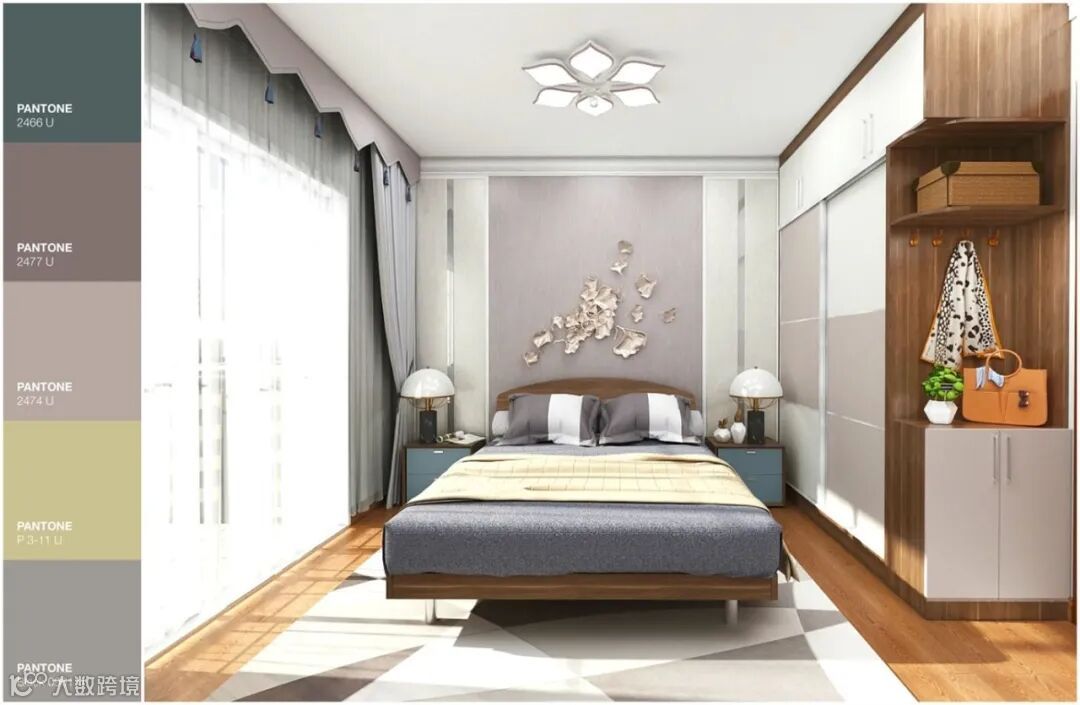 主卧主要以温馨浪漫为主,以香芋紫色为主色,以灰蓝色、黑色、青灰色为辅色,加入蓝色和金色作为点缀,增加设计中沉稳奢华的元素,带来不一样的优雅与质感。