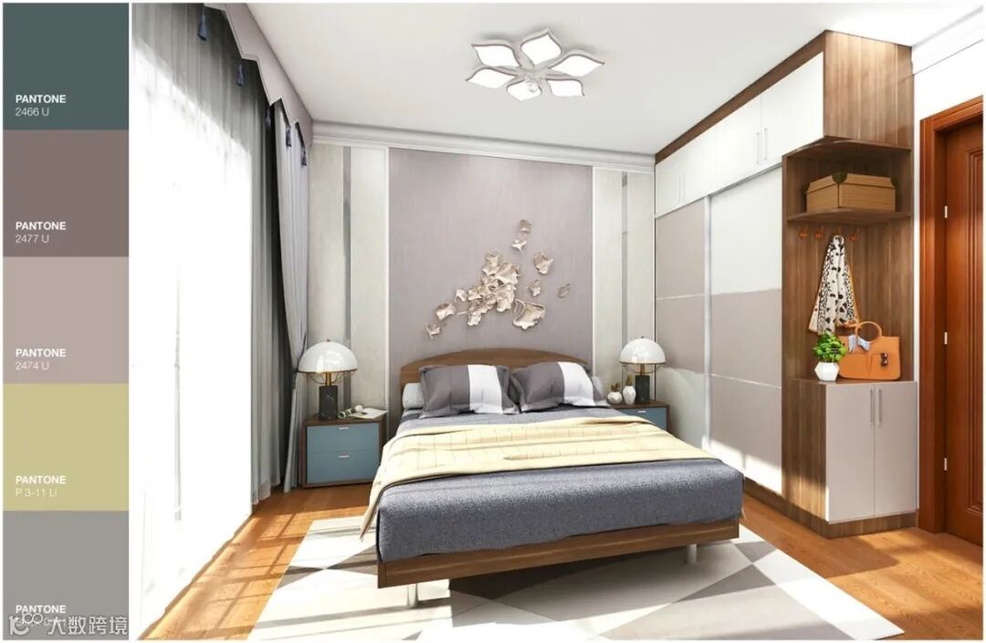 老人房以典雅大气为主,选取胡桃色、豆沙粉为主色,浅灰色为辅色,铜色、蓝色为点缀色。因长辈生活习惯与年轻人不一样,喜静,早睡早起,所以设计师将大阳台隔成两个部分,一部分打通老人房,让老人有一个独立的空间,避免互相影响。