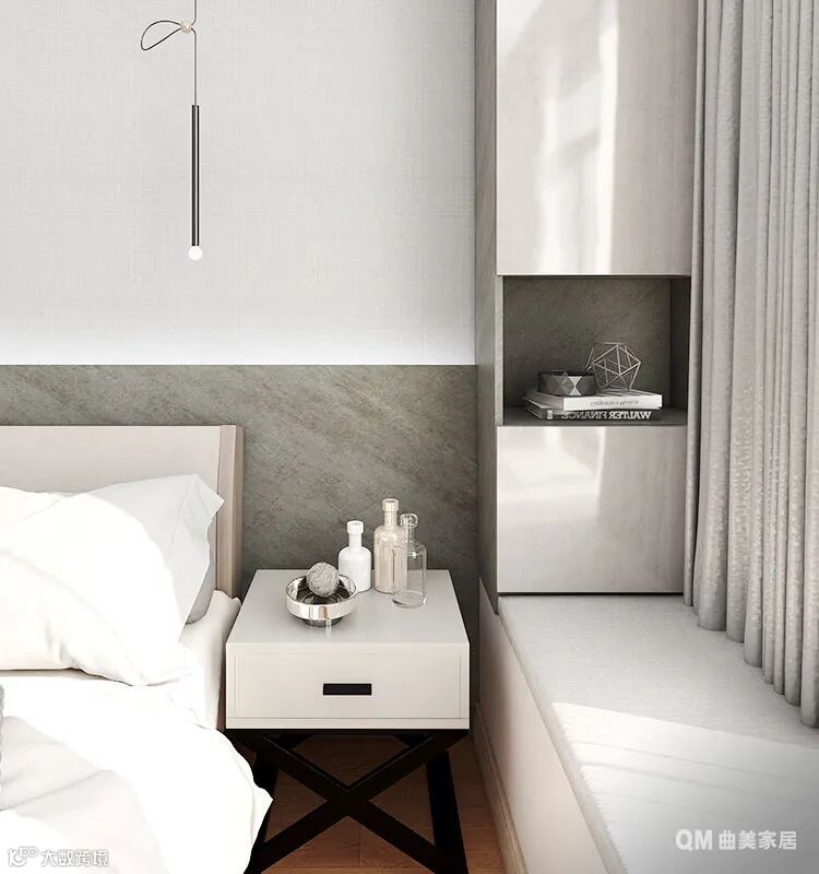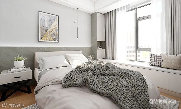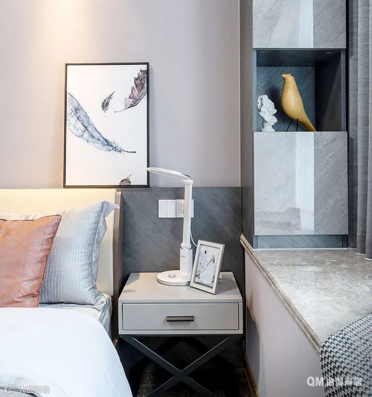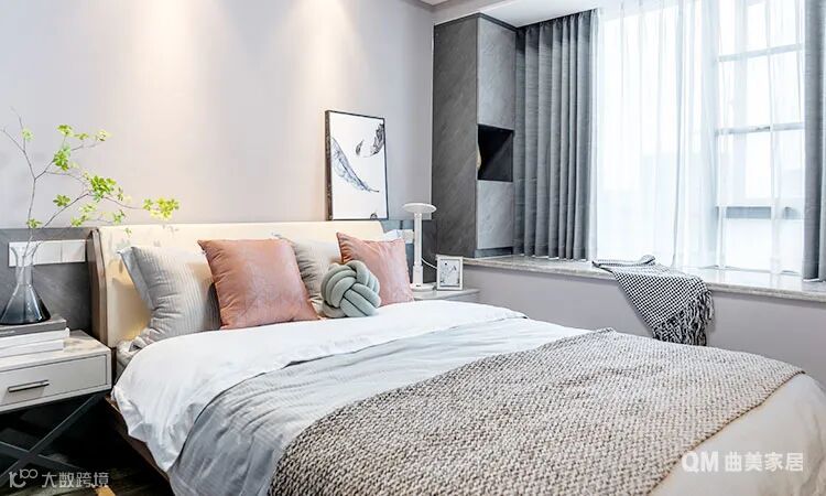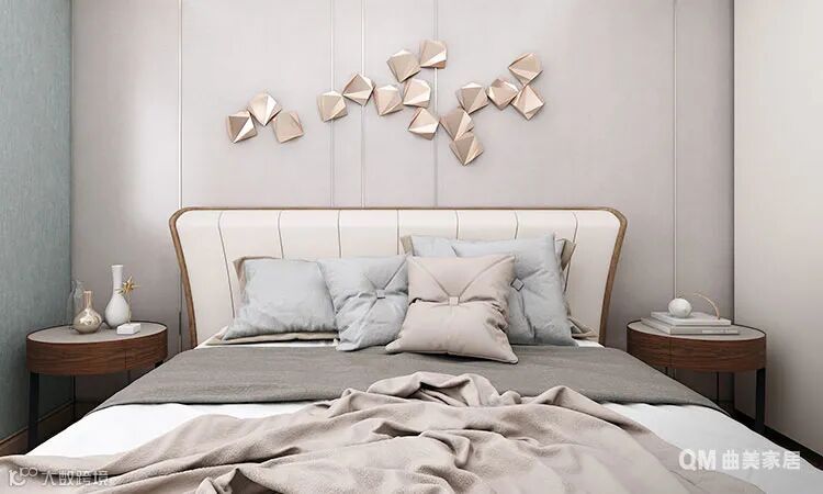 主卧的设计上与实际落地效果做了一些区别,背景护墙板上少了一些点缀装饰,根据实际效果来看,反而刚刚好~