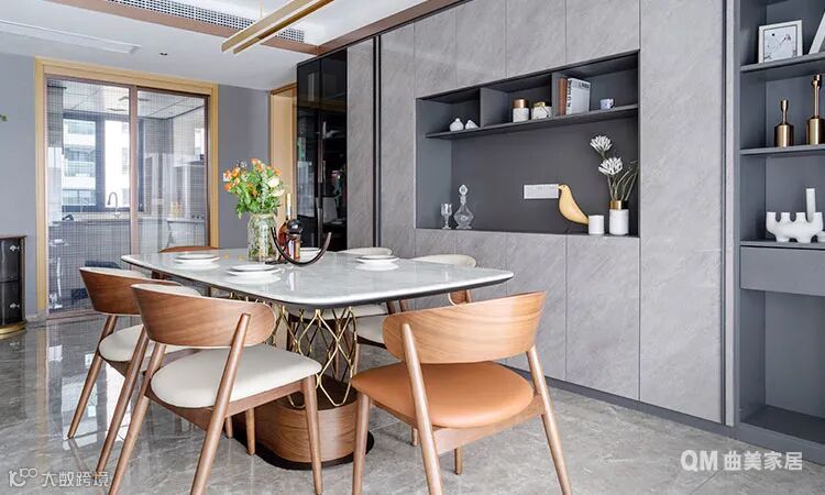 一套“一桌六椅”,搭配高光板定制餐边柜,灰白色调+暖橘色点缀,简单干净,不失格调。