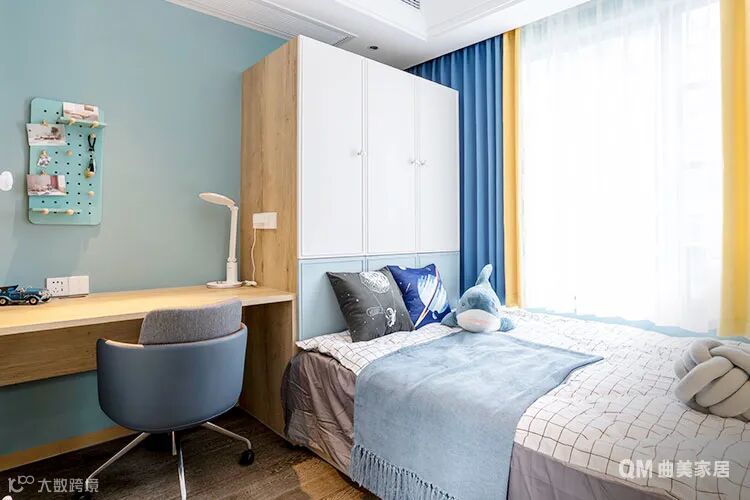 8岁男孩的房间,选择刷纯净的湖蓝色漆面做背景墙,定制了原木色+浅蓝色的榻榻米床,再搭配一张简易书桌和洞洞板,特别适合收纳各种零零散散的小物。