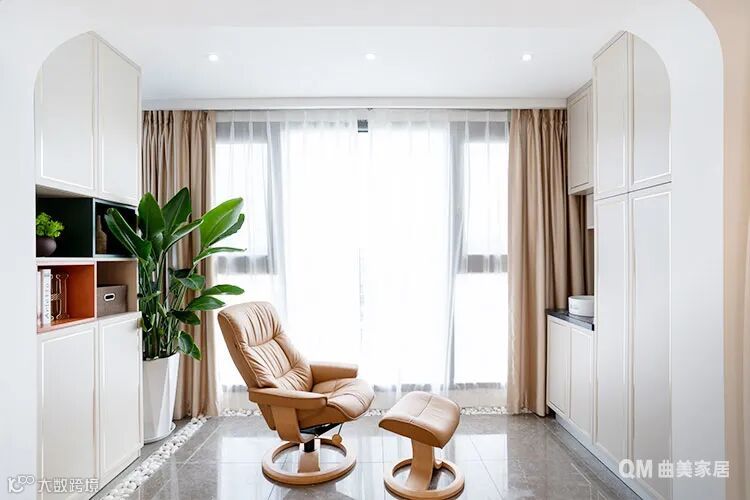 阳台两侧分别定制通顶的定制柜,开放+封闭格局,洗手盆、洗衣机和烘干机内嵌在柜体内,不需要丑丑的晾衣架,解放了阳台更多使用功能。放置挪威躺,就成了一处休闲角~晚上回到家,打开阳台温暖灯光,慵懒的窝在挪威躺椅上,疲惫感一扫而光。