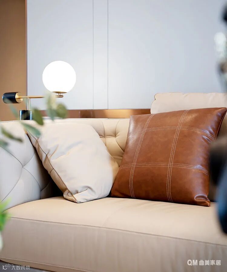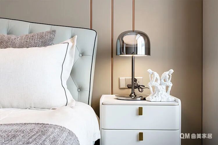 主卧背景板采用温馨的浅咖色,黄铜金属线条做点缀,搭配手工拉点工艺真皮大床,凸显质感。
