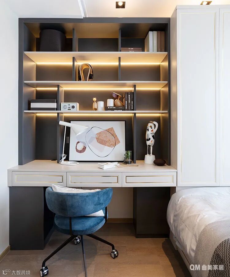 榻榻米房定制完美利用了飘窗的空间,增加了空间利用率,简欧造型一体化定制书柜+衣柜,深灰色当做侧板和搁板,保证颜色搭配舒适又和谐,就得靠设计师的基本功和时间的积淀修炼出来。