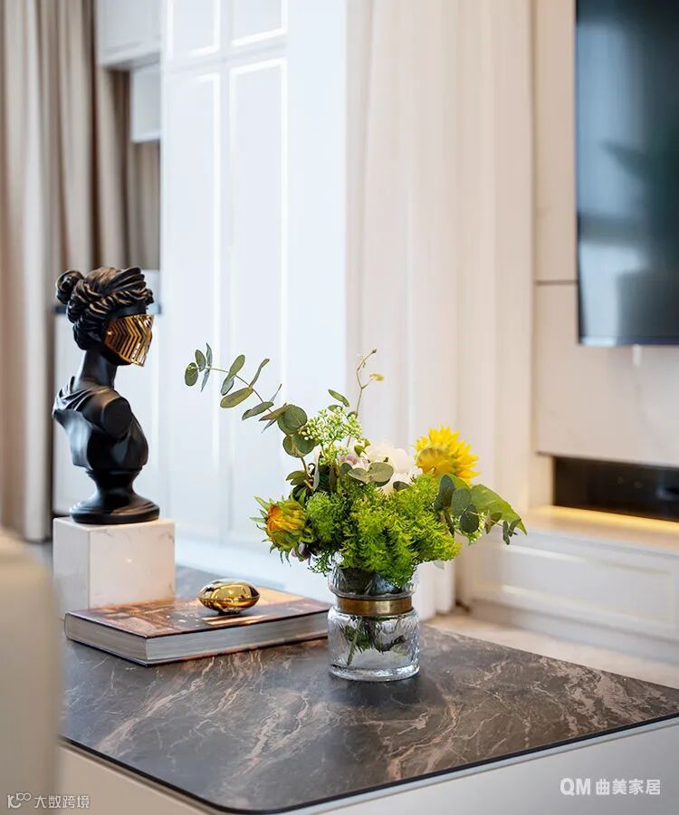 黑色大理石桌面茶几,视觉上足够精致,和整体风格协调搭配。