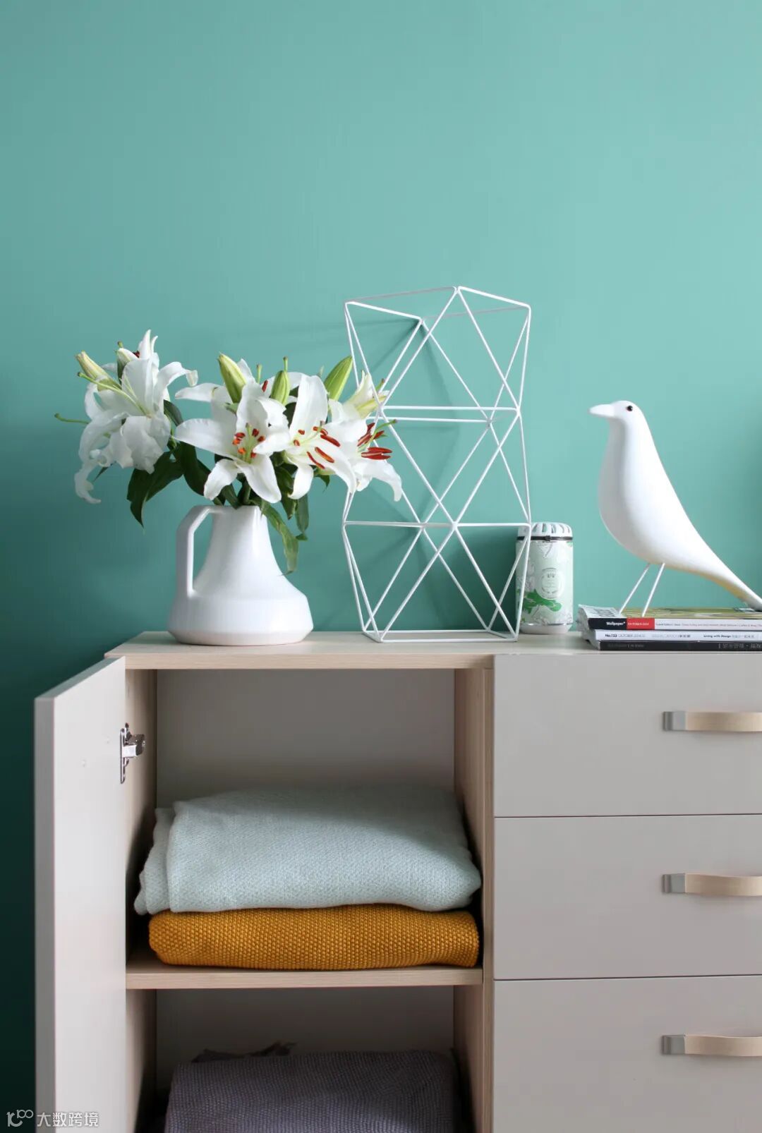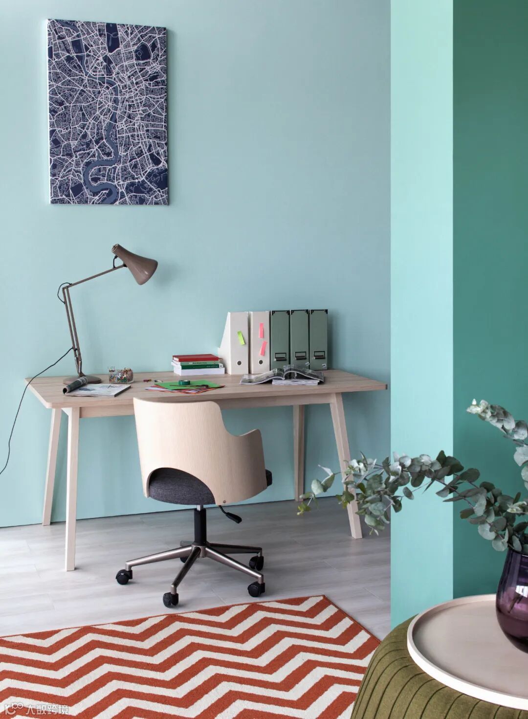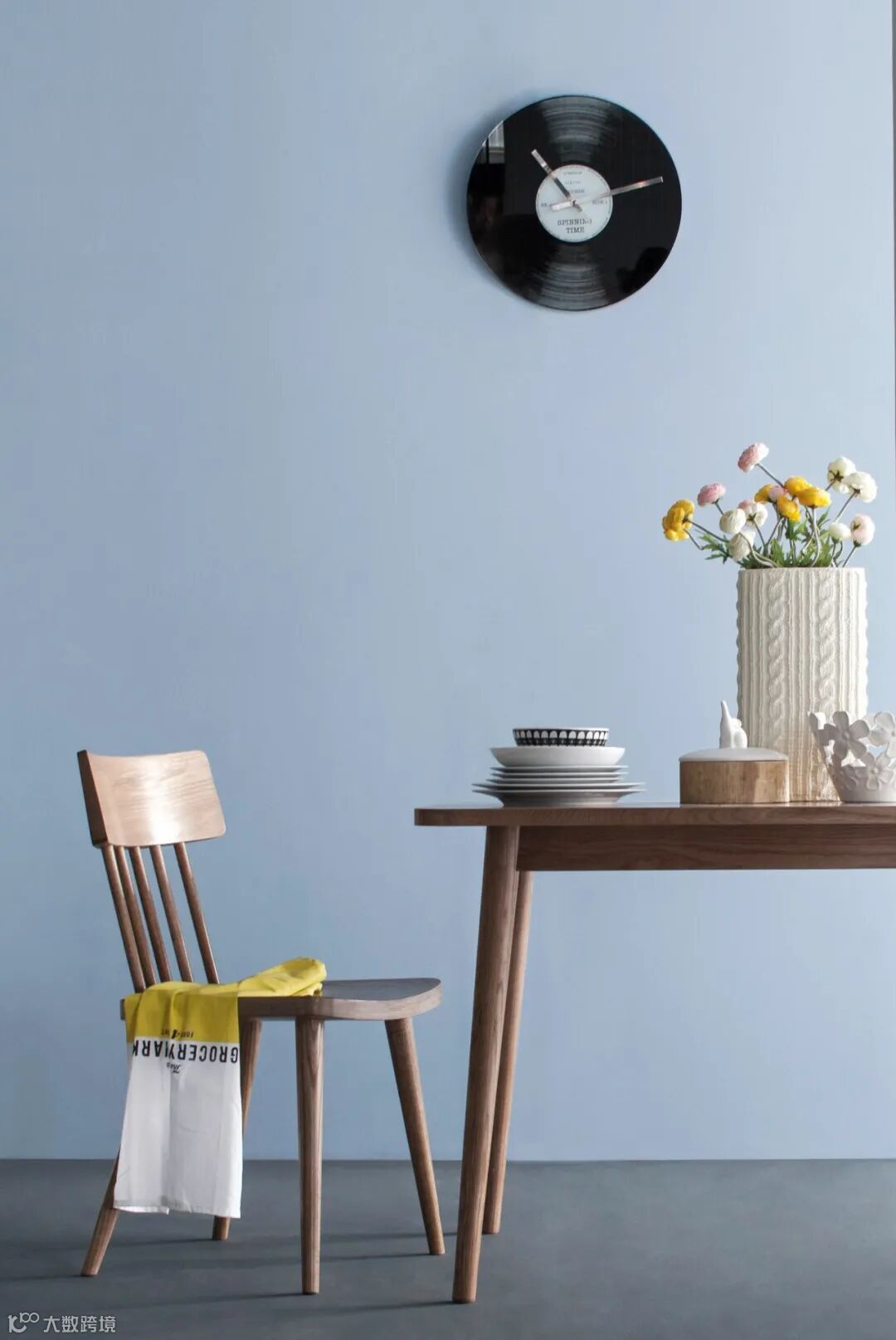 清水蓝带着静谧的气质,具有治愈人心的力量,将它大面积用于墙面,搭配简约清新的北欧风家具,可以打造出安静、清新、柔和、舒适的居住空间。