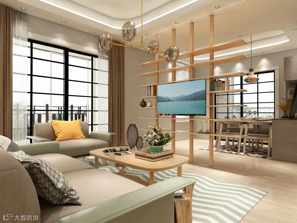最终,客厅的设计通过改变了原先电视背景墙阻碍过道的问题,使整个空间更为敞亮整体。我们一起来看看。