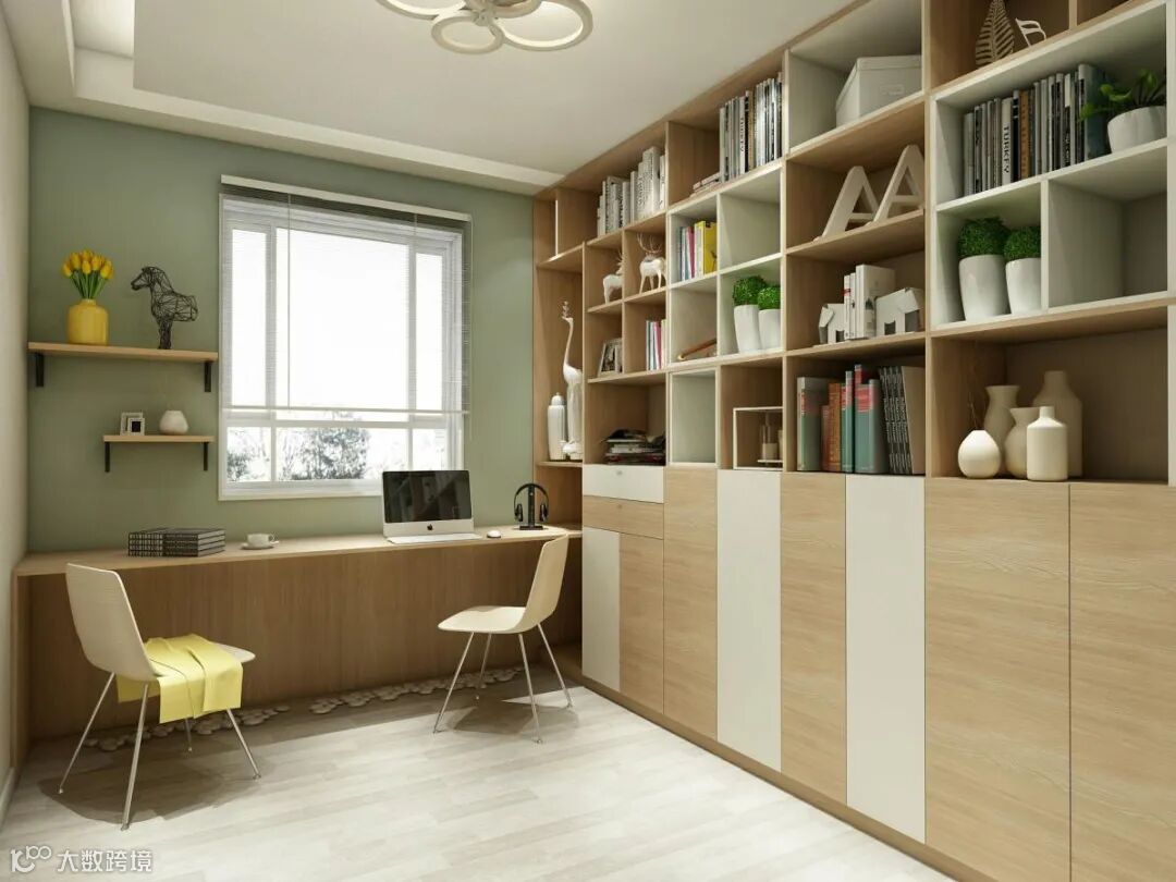 考虑到业主有收藏书籍和喜欢看书的爱好,通过定制书房,打造一个既能办公又能储物的空间。AB墙面做了一个色彩的跳跃,选用抹茶绿与暖黄色装饰物的色彩碰撞,让书房宁静舒心,适合学习办公。