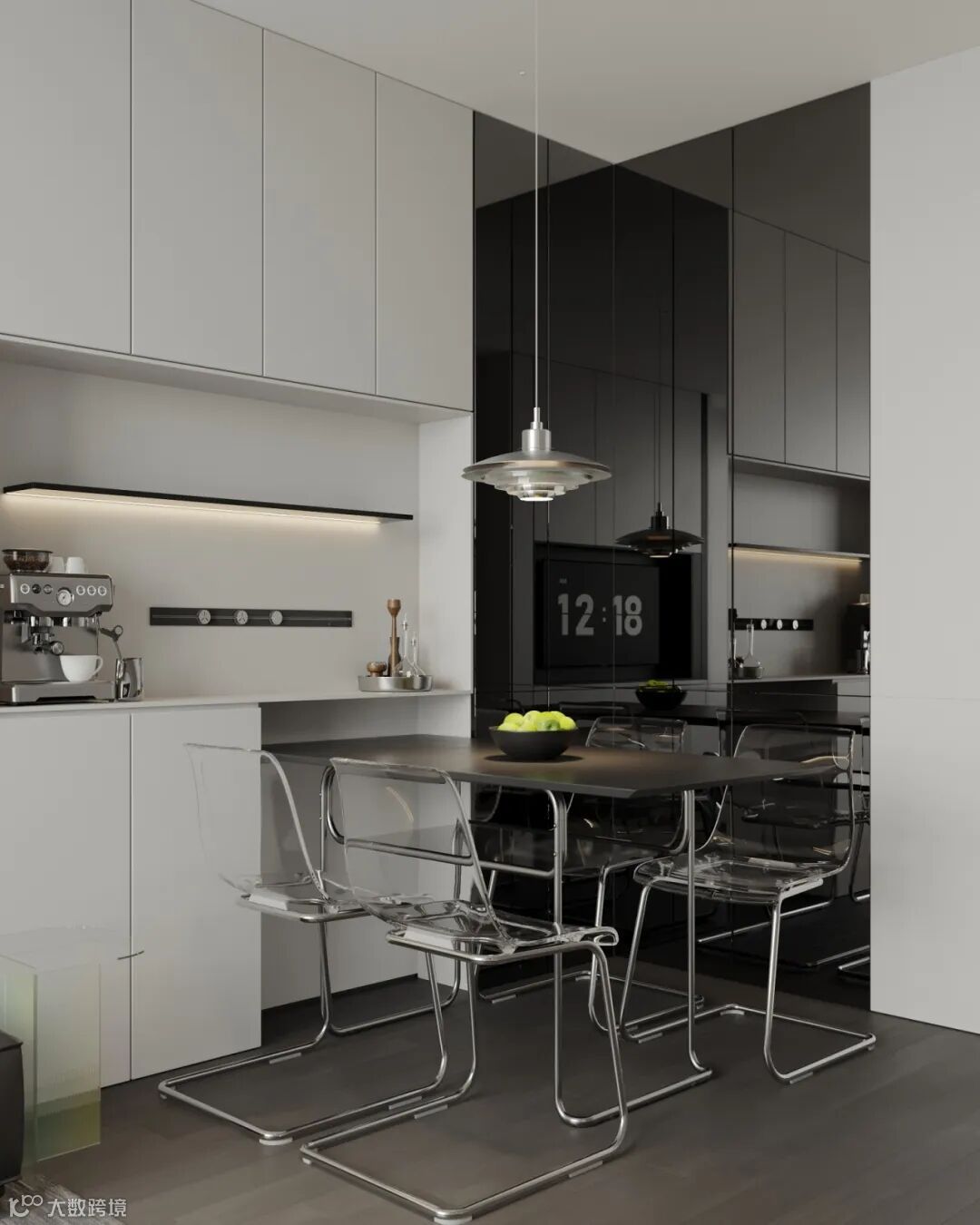 黑色的线条笔触与材质的反射,是纯白底色上有形的点缀与渲染,勾画出简洁明朗的空间走势。光影之下,敞亮的空间视野,静谧的环境氛围,低调地演绎着黑白灰的旋律。