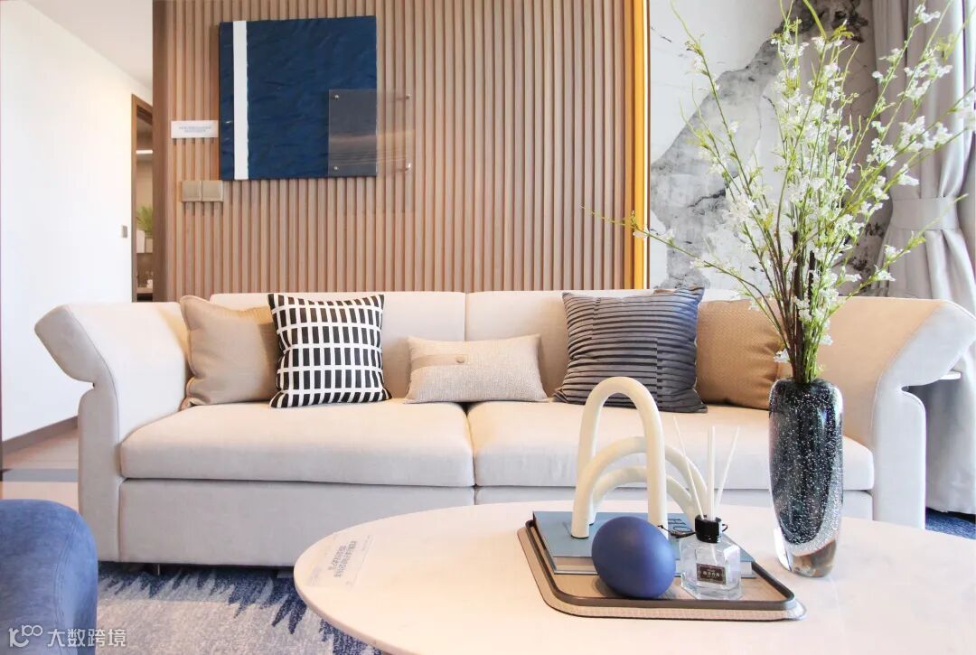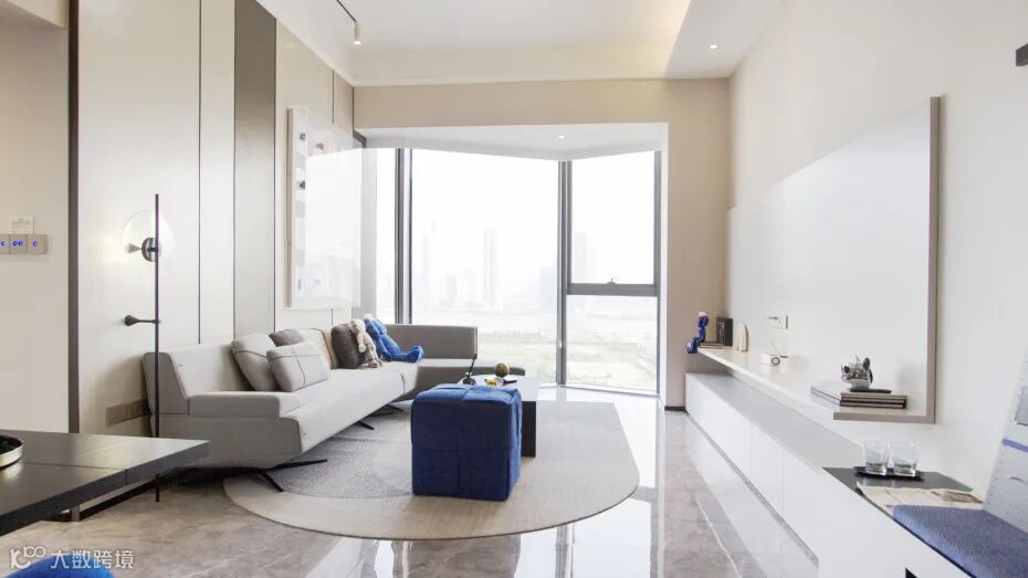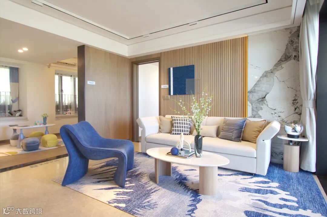 白色沙发搭海蓝色流线形单人椅,增加了房间的流动感和动感。将大海的美丽和神秘感融入到室内空间中,让人感受到海洋的氛围和美丽。