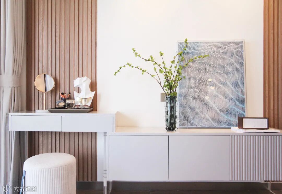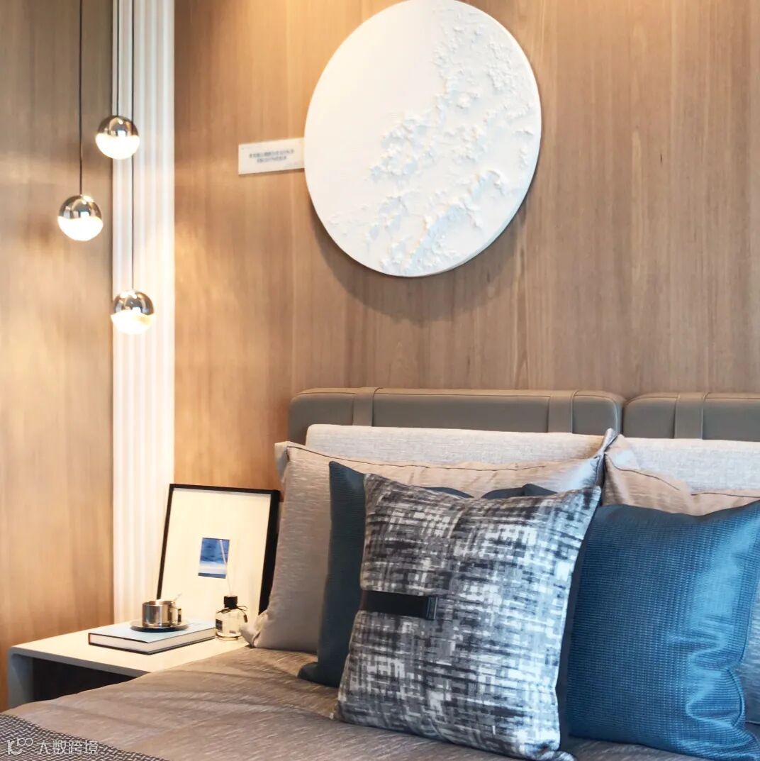 以深蓝、浅灰为主色调,配合水波纹元素的插画及墙面装饰,创造出宁静和放松的氛围,打造具备现代感和功能性的卧室以。