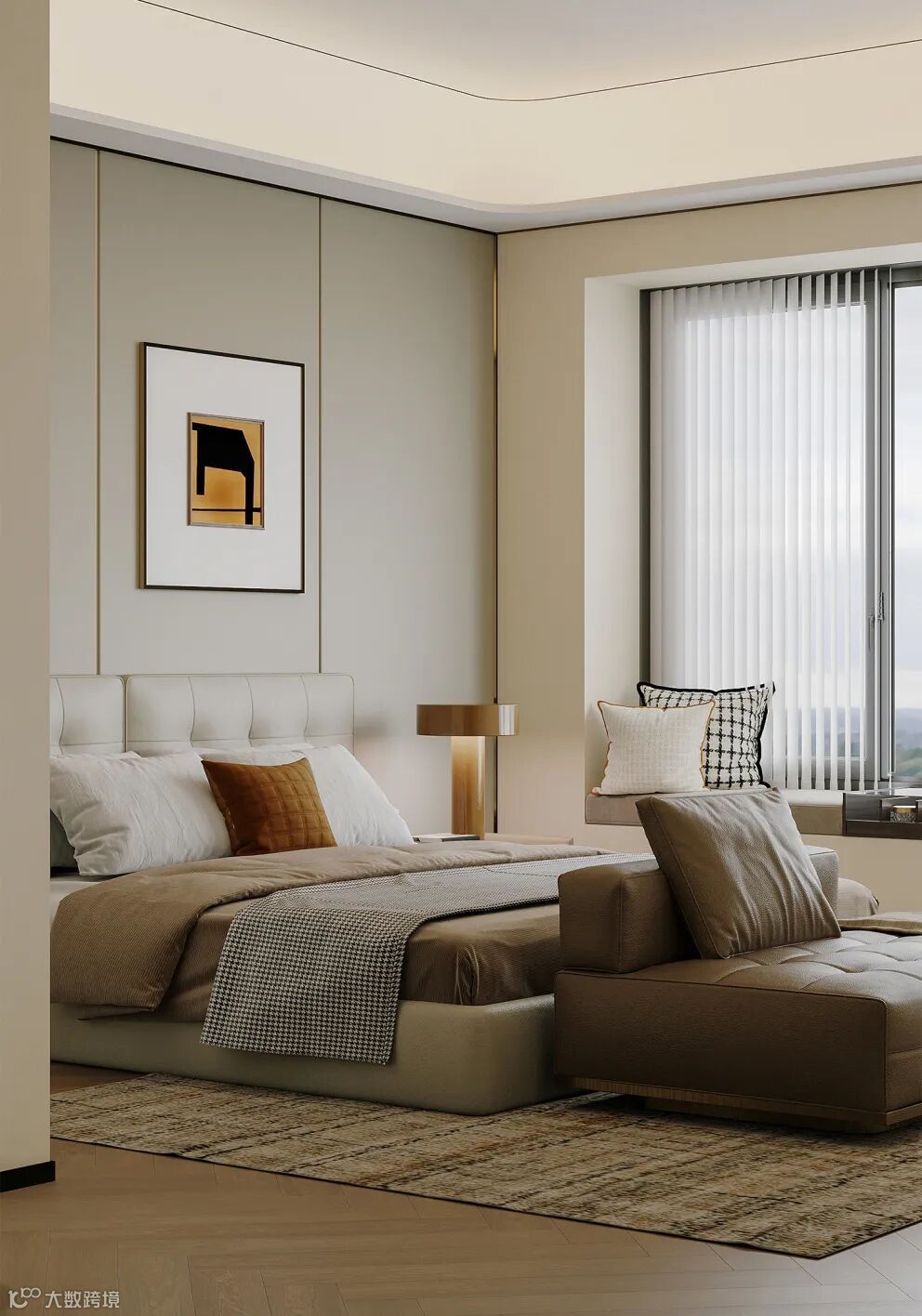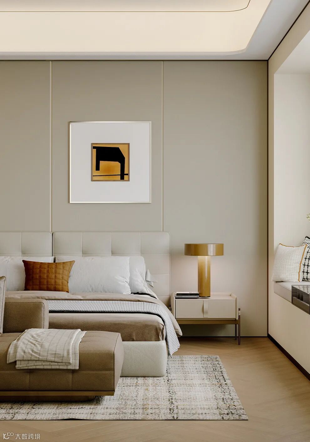 注重细节处理,如床头背景采用金色线条勾勒造型,灰调色块令空间更具层次感。绿色把视觉调和的温婉柔和,演绎出家居生活中的闲适。