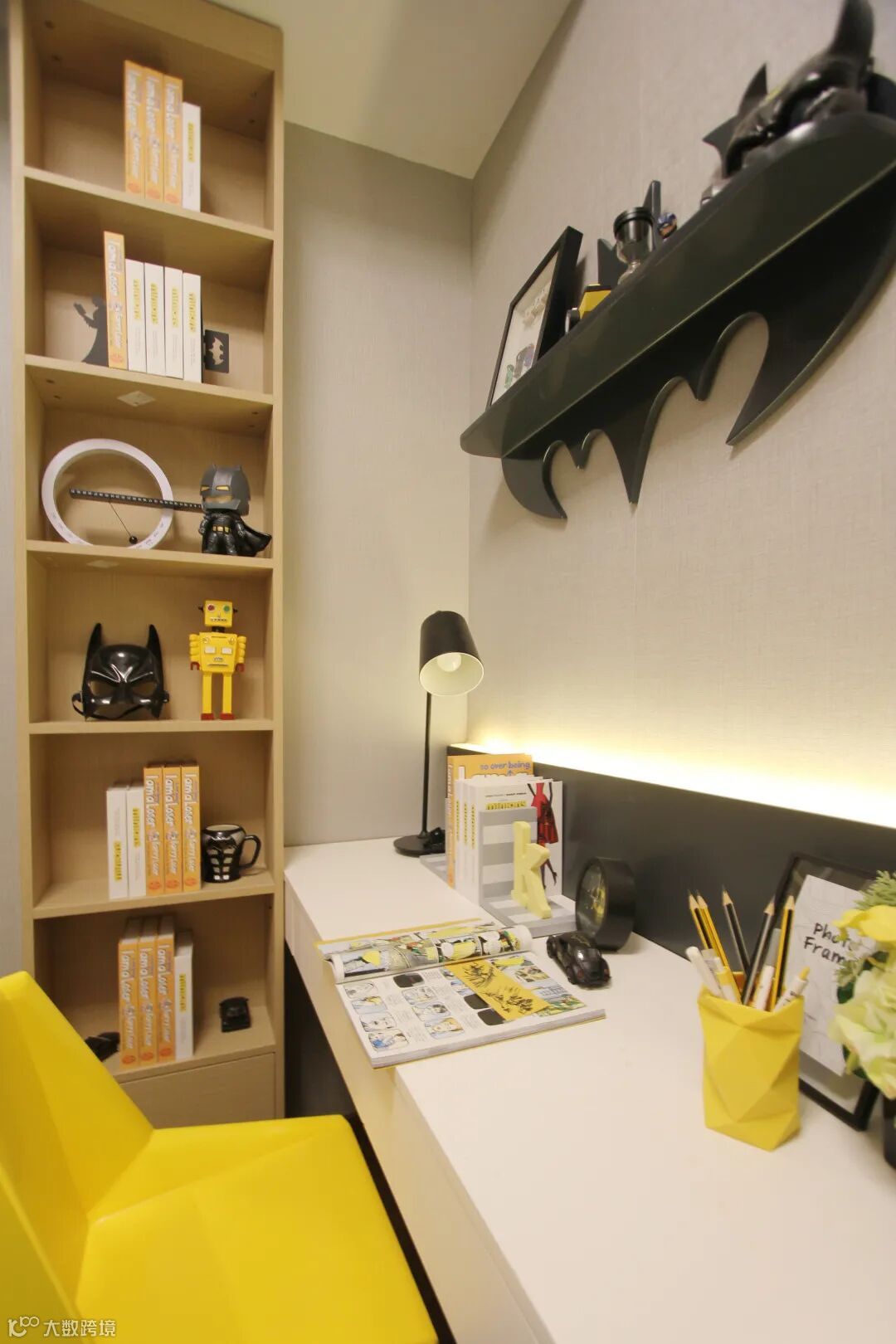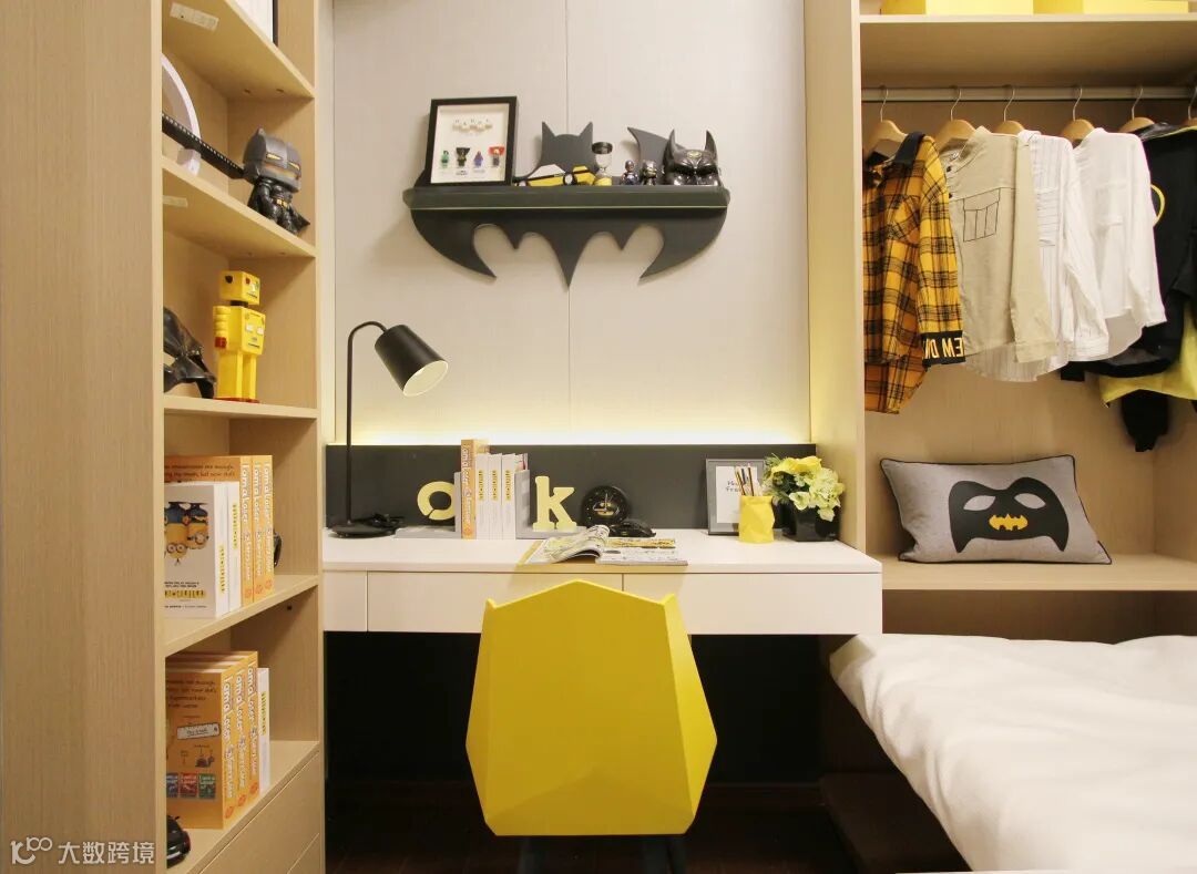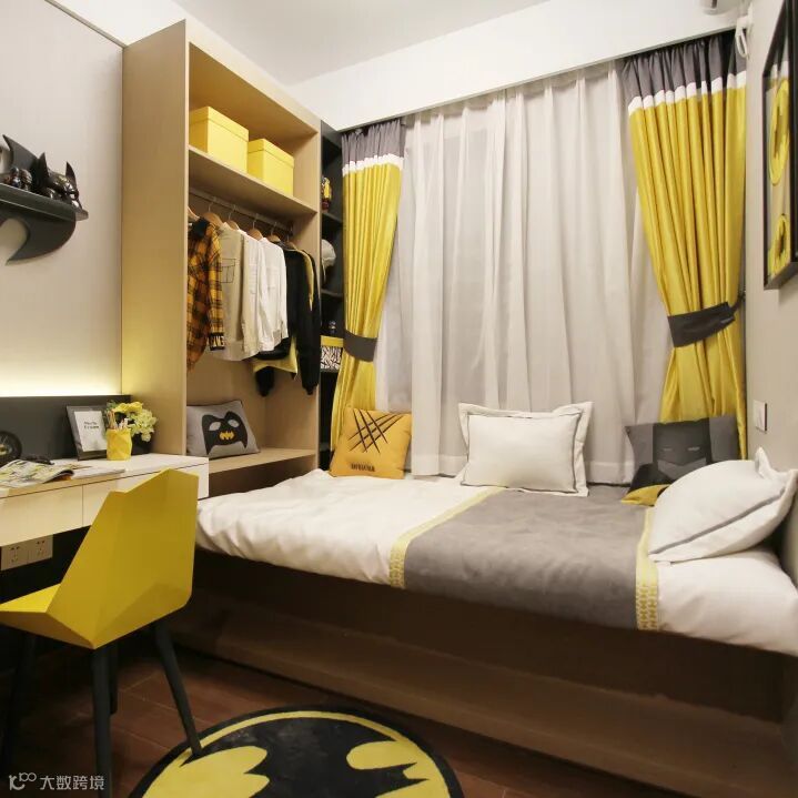 儿童房选择了活泼的明黄色,运用了小男孩喜欢的蝙蝠侠元素,榻榻米+书桌+衣柜的一体化组合,既实用又体现设计感,小小的空间也能满足储物、学习、休息多项功能。