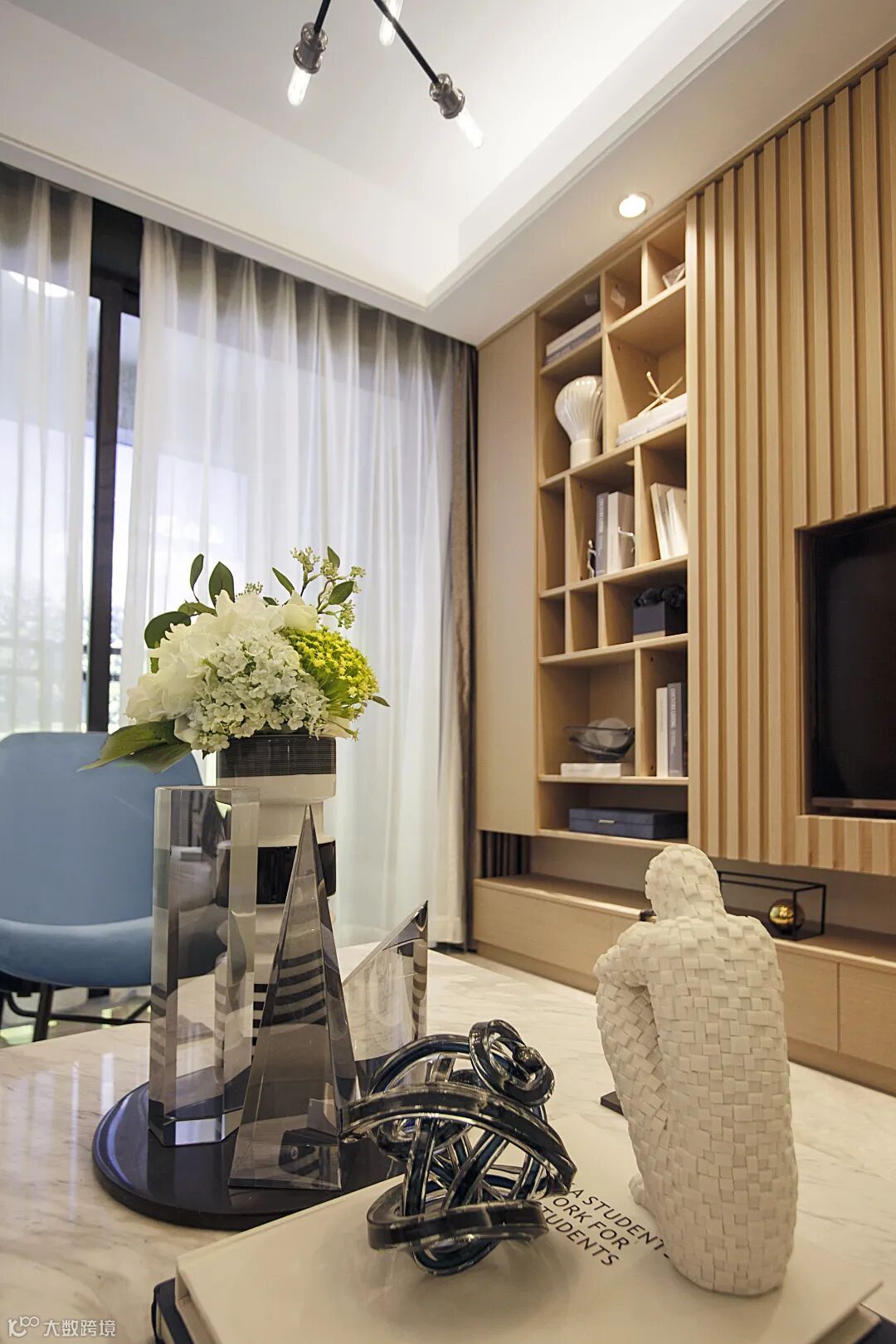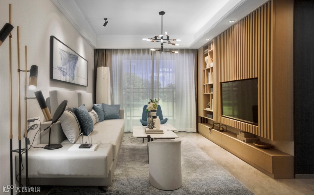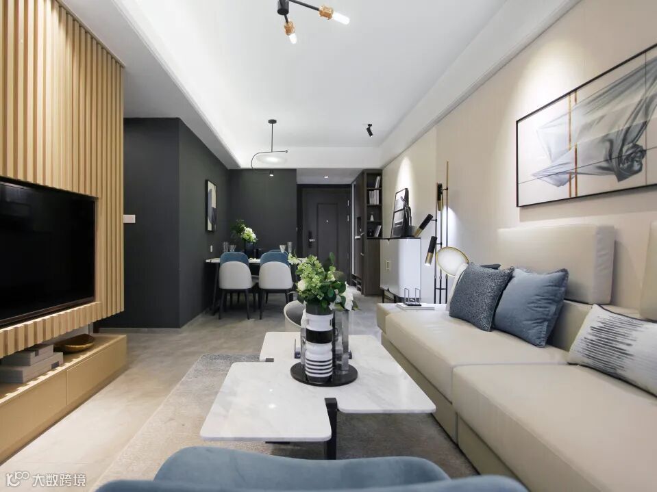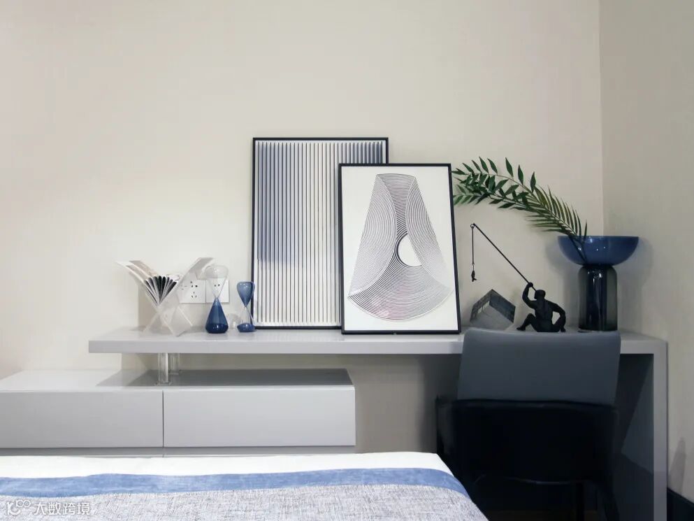 清浅的色彩中点缀一抹蓝,打破黑白灰的素雅,木格栅的自然质感,体现秩序与规律美,现代画作与个性装置的融入,抒写都市生活中的艺术格调。