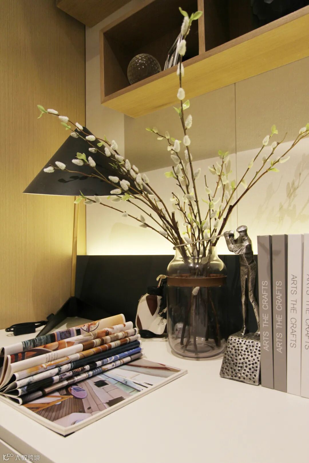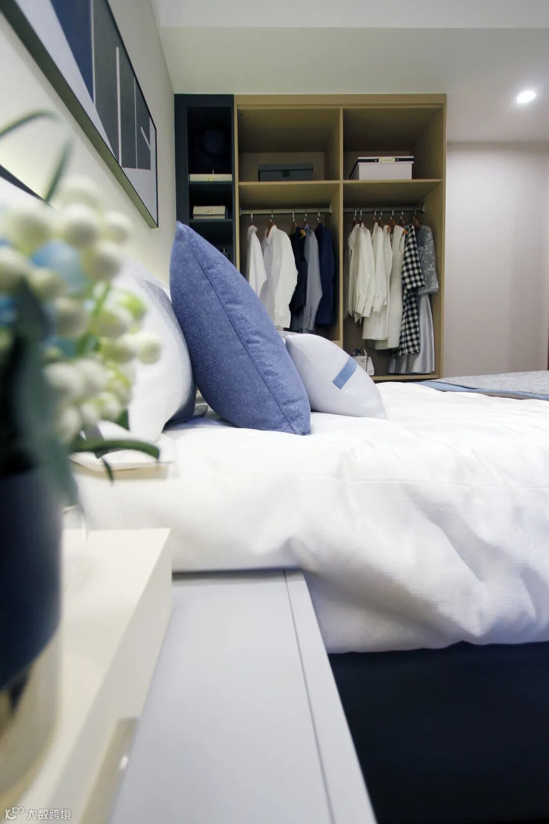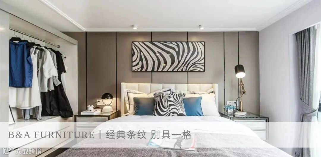 清浅的色彩中点缀一抹蓝,打破黑白灰的素雅,木格栅的自然质感,体现秩序与规律美,现代画作与个性装置的融入,抒写都市生活中的艺术格调。