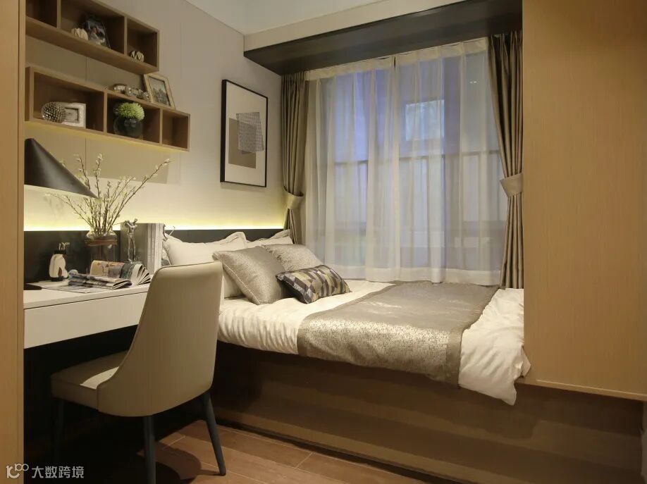 次卧运用原木色和银灰色,营造典雅舒适的空间氛围,榻榻米与飘窗结合,既不会阻碍视野,也不影响采光,木质置物架简洁大方,和谐自然。