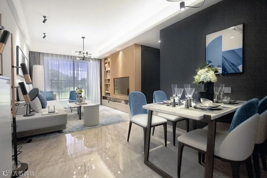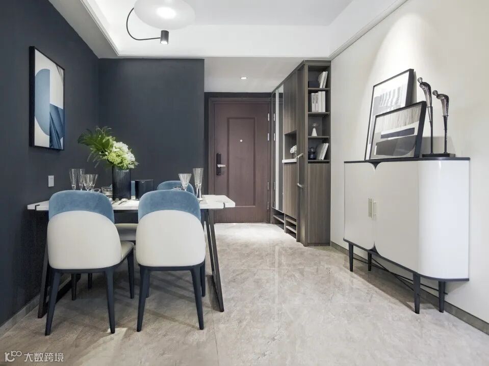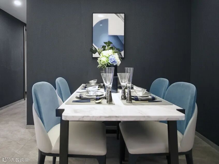 雾霾蓝绒面餐椅舒适耐看,自带高级感的白色大理石桌面既优雅时尚,又提亮了餐厅空间。深色背景墙与现代装饰画的搭配,在整体柔和复古的底调中渲染一抹朦胧的滤镜,摩登感十足。