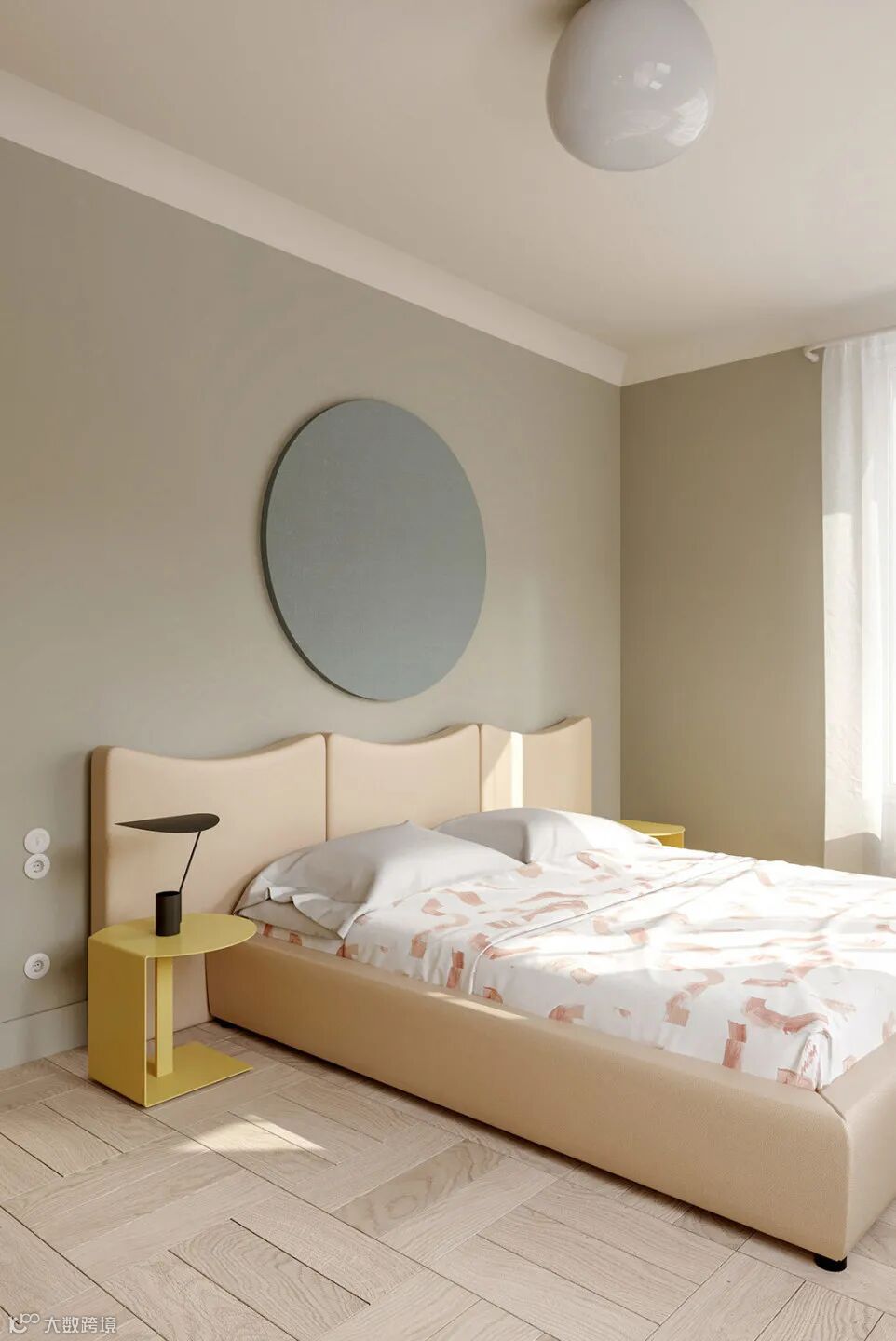 主卧延续整体简约雅致的格调,清新淡雅的床品、同色系装饰画、造型独特的球形灯饰、悬空式床头柜,共同塑造出宁静平和的休憩空间。