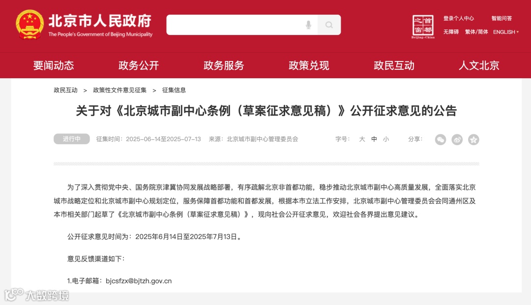 6月14日,北京城市副中心管理委员会发布了关于对《北京城市副中心条例(草案征求意见稿)》公开征求意见的公告。