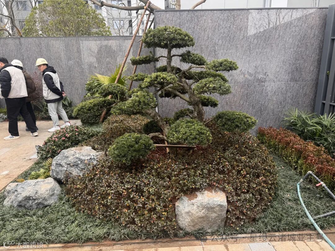 建议3:关于今天开放区域的迎客松,可以再抬高一点,现在是在一个灌木围合的圆形低洼处,既无法凸显迎客松的气势,也不美观,下面的灌木搭配建议重新组景,现在的围合式组合的三块景石没有设计感,石头选择也比较随意。