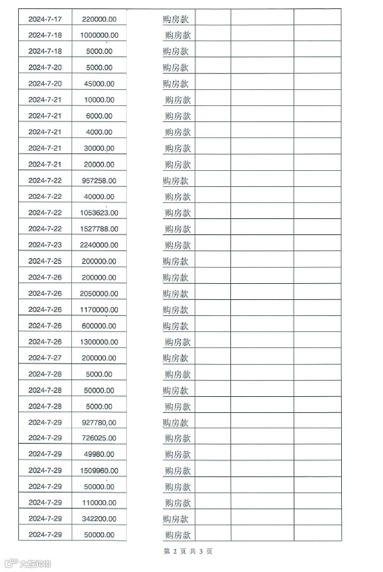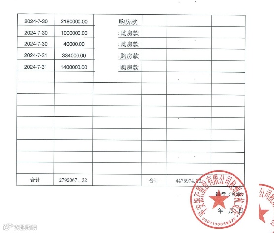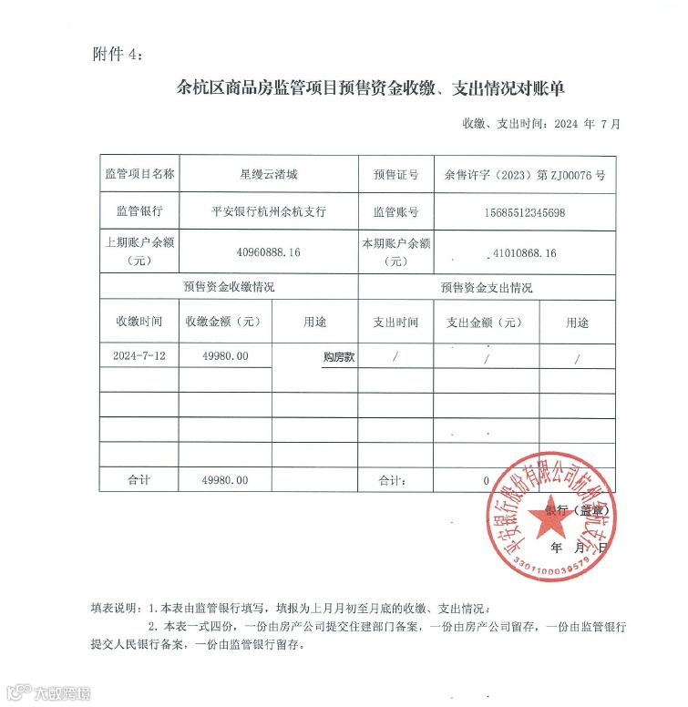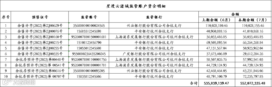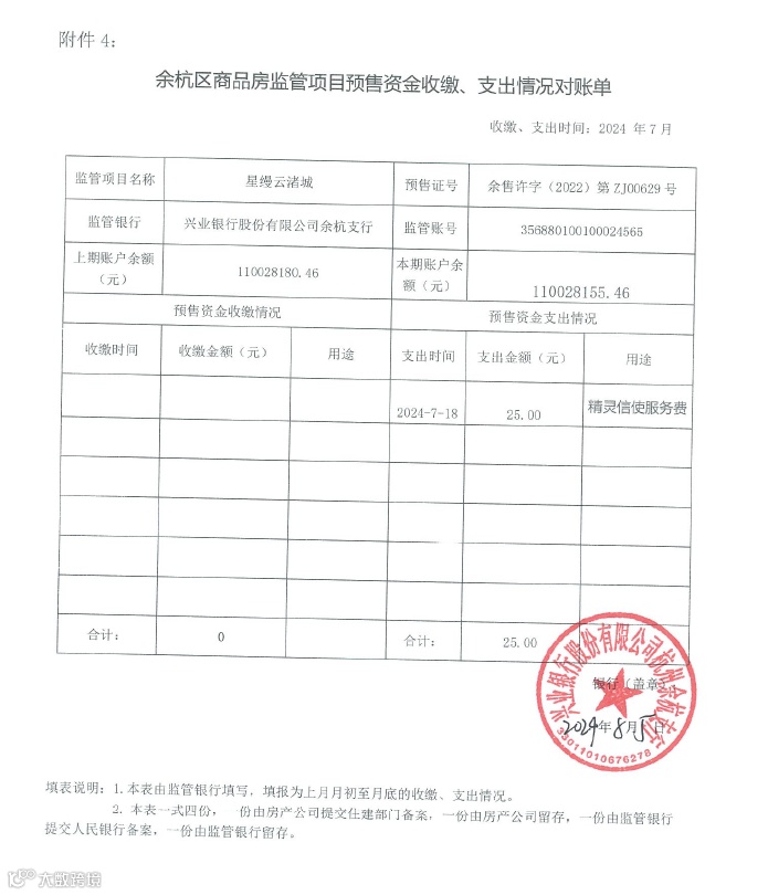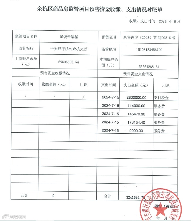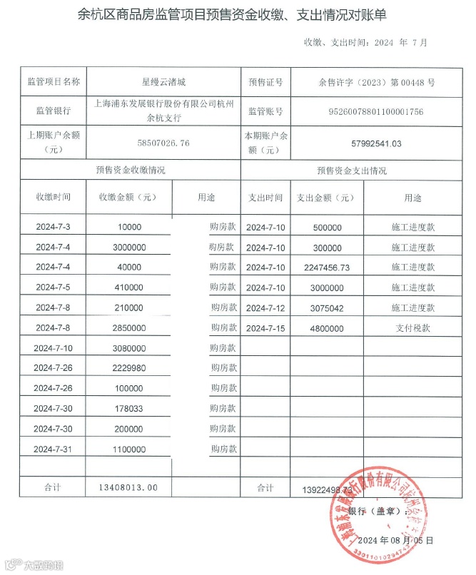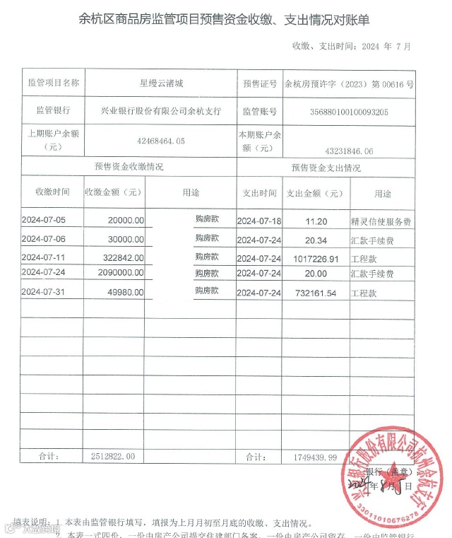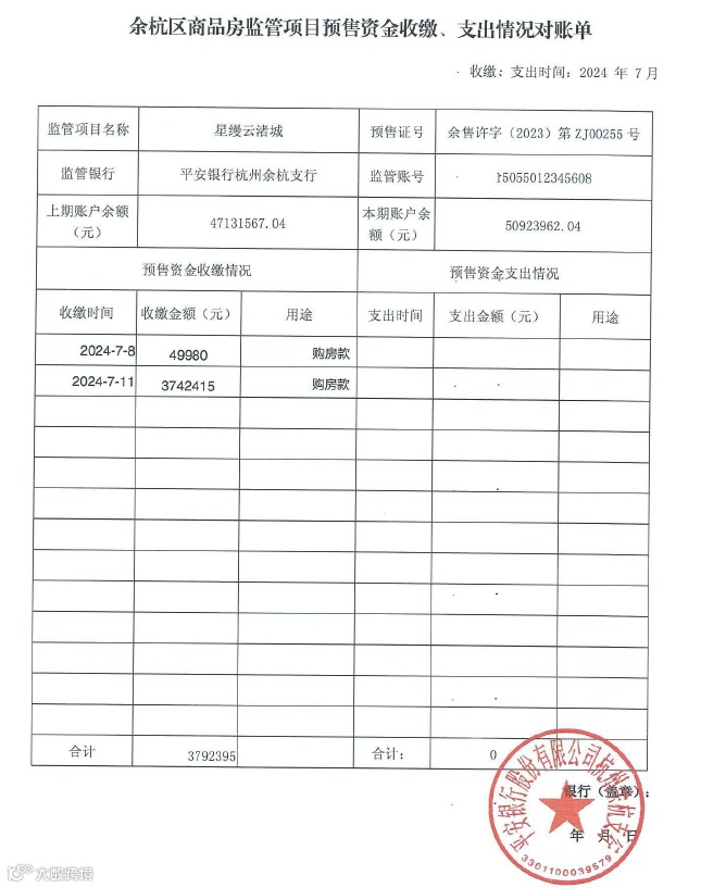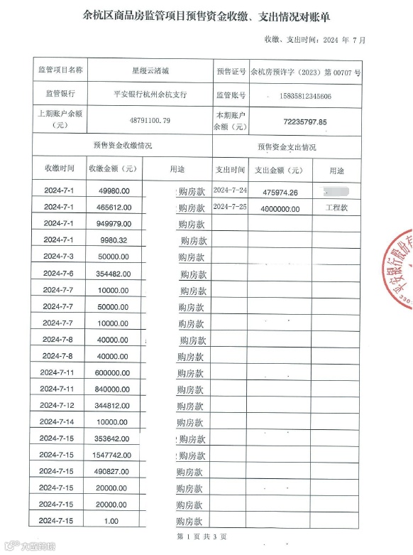 星缦云渚预售监管资金对账单|7月