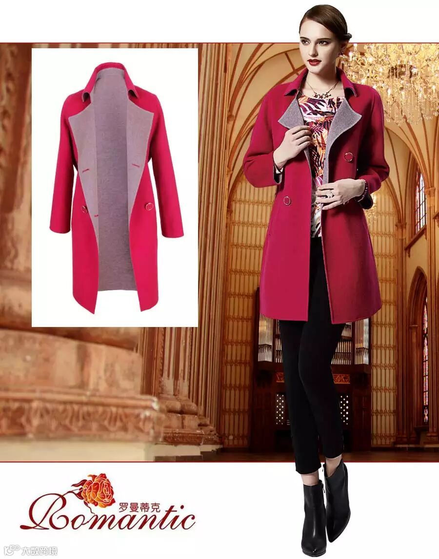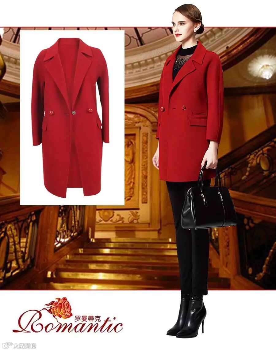 玫红色双面呢大衣与多彩印花打底衫协调统一。大翻领不经意露出的印花打底小衫,展现饱满的色彩和丰富的层次,黑色的铅笔裤简约且有国际范儿。