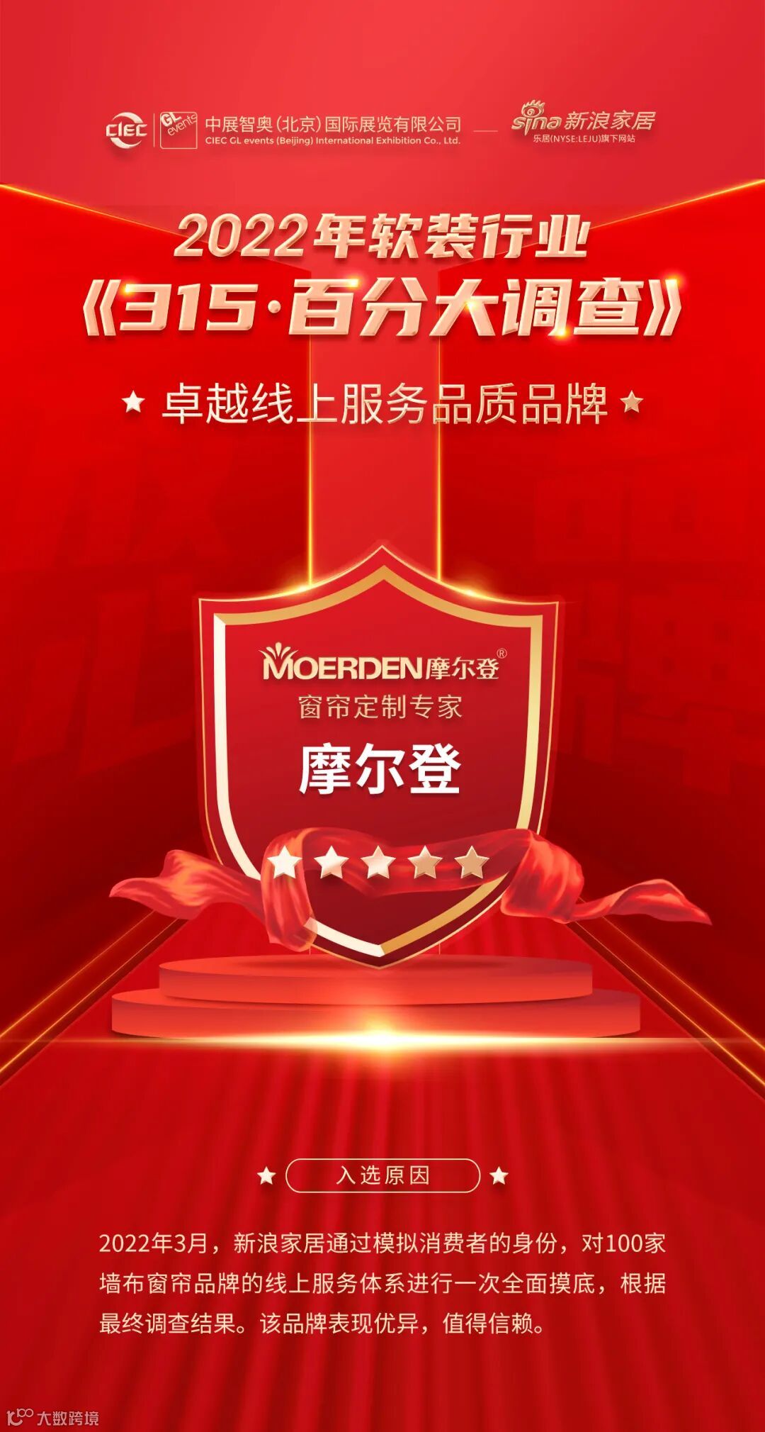 此次调查,新浪家居从电话、官网、微信公众号三个维度出发,按照4:3:3比例测算,其中摩尔登窗帘品牌在此次调查活动中表现优异,荣获卓越线上服务品质品牌!