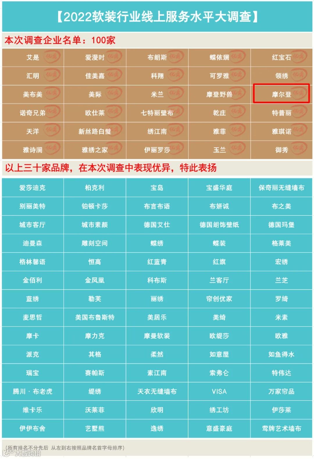 摩尔登窗帘软装总部2021年3月,新浪家居通过模拟消费者的身份,对100家墙布窗帘品牌的线上服务体系进行了一次全面摸底,根据最终调查结果,摩尔登窗帘品牌表现优异,值得大家信赖!