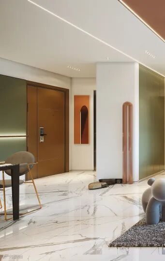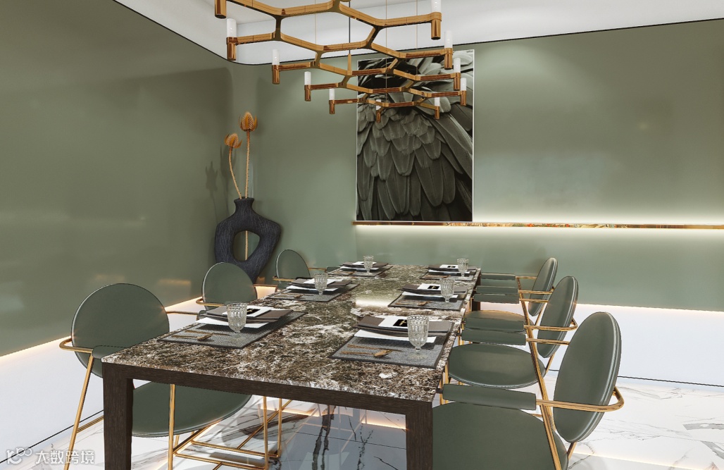 餐桌同样也是用了偏绿色色调的大理石餐桌,在餐椅的衬托下,整个餐厅显得非常高级但不浮夸,皮革与金属的搭配,也提升了整个空间的质感。
