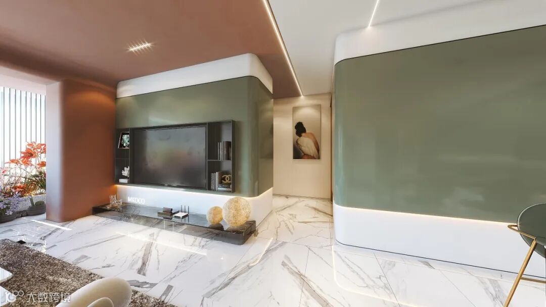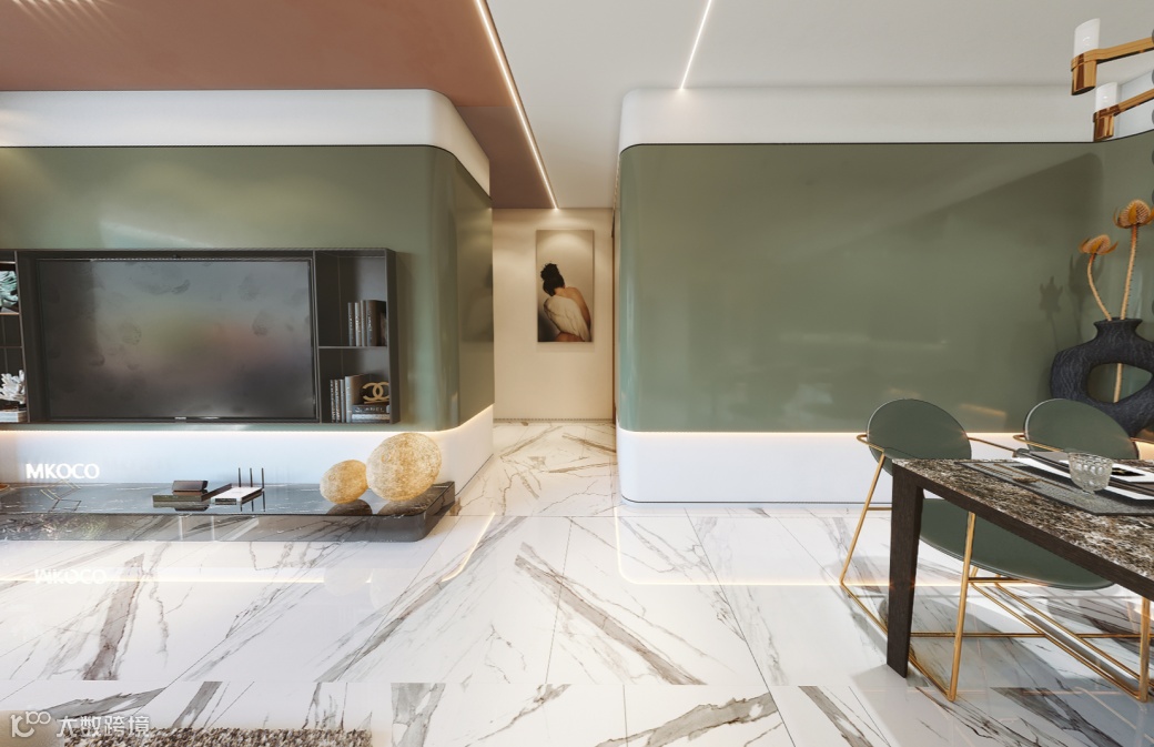 墙面采用抹茶绿+白色的搭配,让空间更具有层次感,加上意式轻奢家具的融入,以及充满生机的大量绿植点缀,让轻奢和生机两者之间很巧妙地结合在了一起,碰撞出了如绿野仙踪般的感觉。