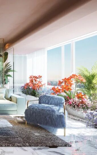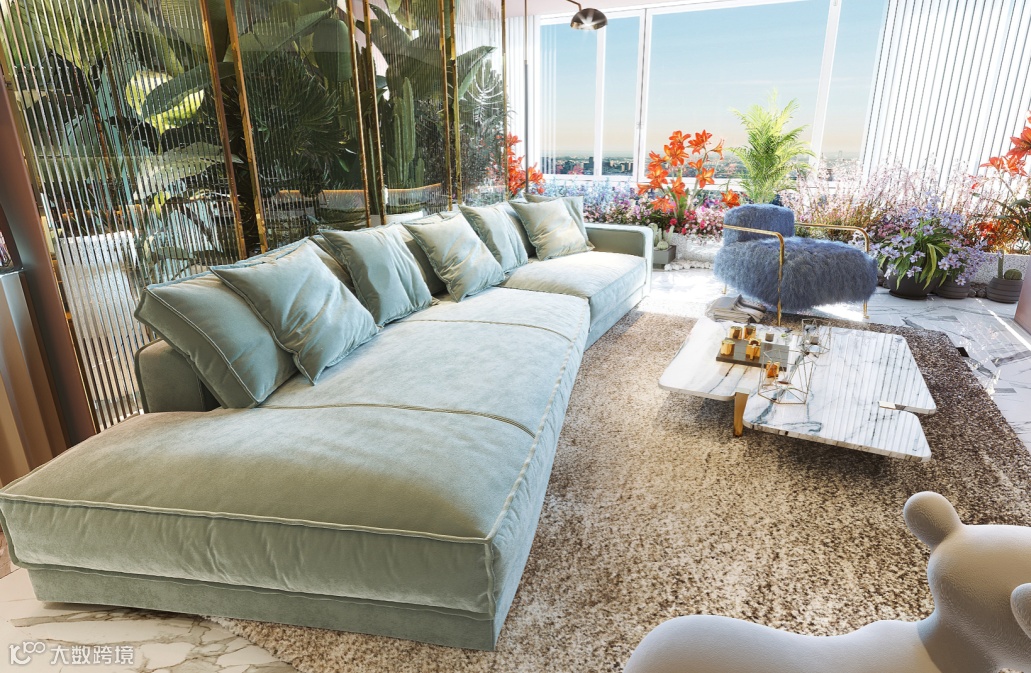 超大的落地窗,让客厅显得通透宽敞。边椅和沙发都选用MKOCO高定系列的Baxter大斜角沙发以及Baxter蓝色真羊毛椅,凸出了业主高级时尚的品味,同时柔软亲肤的面料让人倍感亲切。