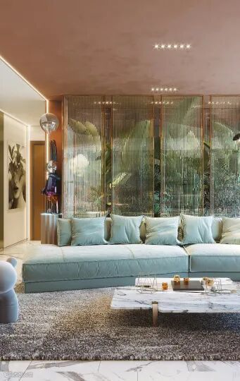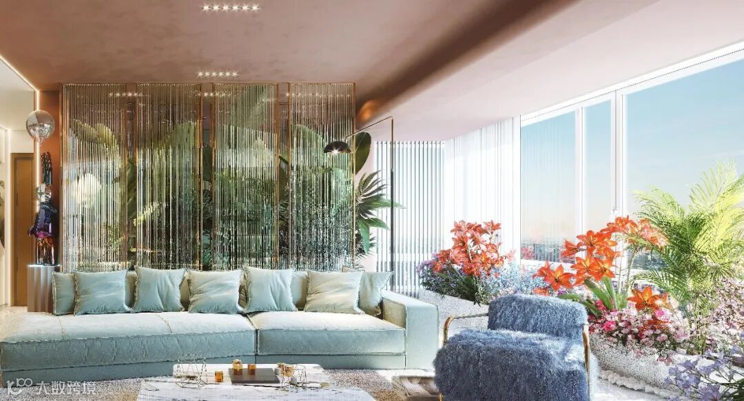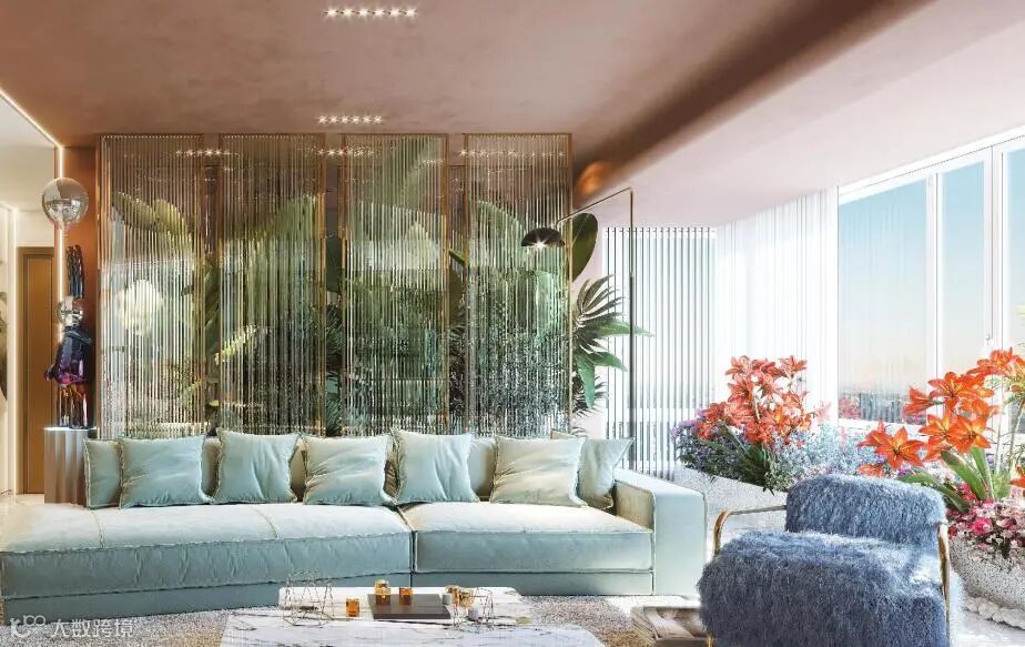 本案主体色调采用了类似抹茶绿的颜色,个性大胆的运用了很多绿植来做点缀,加上充满质感的金属摆件,让整个空间在充满生机的同时又散发出轻奢的魅力。