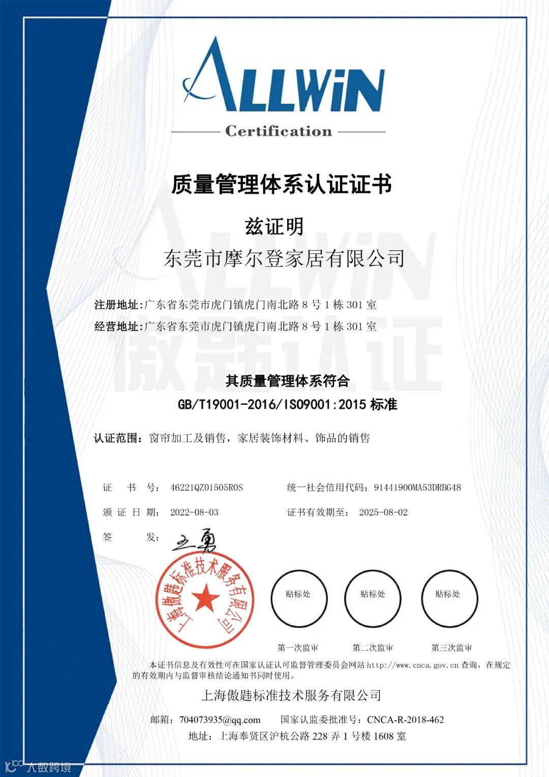 摩尔登为了进一步提高消费者服务水平、增强消费者信心,促进门店运营体系完善,为门店运营增值赋能,强化窗帘产品的研发、生产与销售管理水平,特此导入ISO9001质量管理体系,并顺利通过ISO9001质量管理体系认证,严格把控每一个环节,对自己负责,对消费者负责,对行业标准负责。