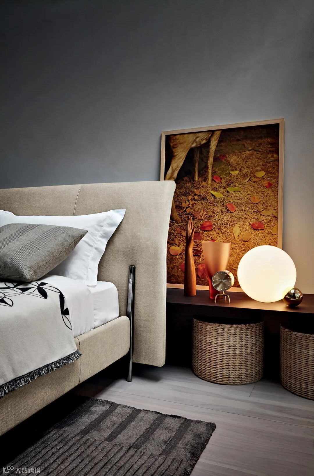 床头和床头墙巧妙搭配,进口牛皮紧紧包裹着床头,当皮质质感与床头墙相结合,一动一静,丰富整体卧室层次感。