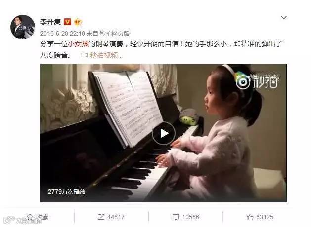 视频走红后,李开复也转发了她弹琴的视频,称赞她“手那么小,却精准地弹出了八度跨音。”