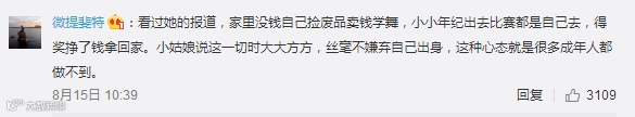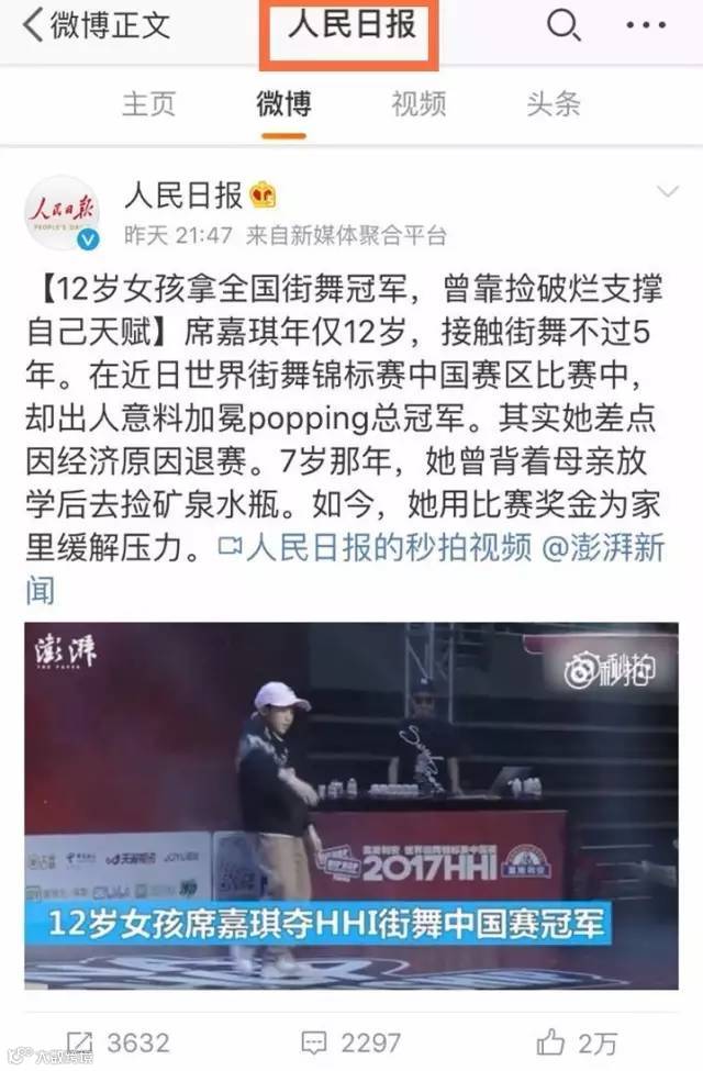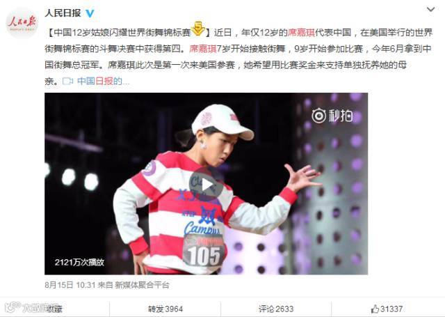 她9岁开始参加比赛,12岁拿下全国街舞冠军,随即杀入世界四强;她和妈妈相依为命,曾靠捡破烂支持天赋;她的梦想是长大后到世界各地跳舞,人民日报也为她点赞。