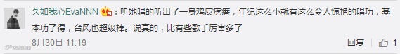 她被称为“巨肺萝莉”,6岁参加《中国新声代》获歌手茜拉点名称赞;她翻唱超级天后玛丽亚·凯莉和惠特妮·休斯顿的《when you believe》,让所有评委和观众惊呼“amazing”;美国女影星Laverne Cox听完她的演唱后称赞她的嗓音犹如天赐,开玩笑说想要把她带回家。