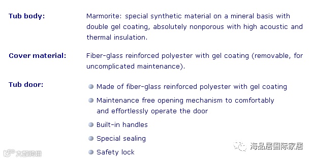 ✦ 浴缸本体: 特殊的矿物基双凝胶涂层合成材料,绝对无孔,保温隔热