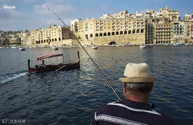 一名渔夫在马耳他首都瓦莱塔水湾中钓鱼,水边矗立着一排石屋。